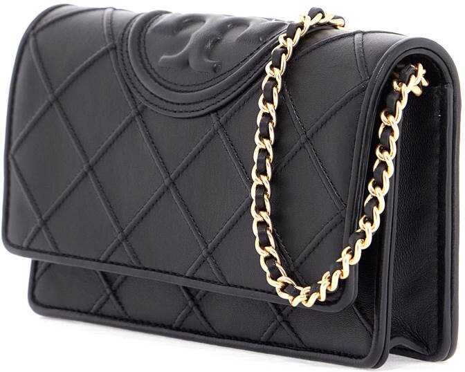 Fleming bag by Tory Burch in nappa lambskin with embossed diamond quilting and embossed maxi Double T logo on the top. leather-woven chain strap to carry on the shoulder or crossbody. Flap with magnetic button closure and fabric-lined interior with a slit pocket, a gusset compartment with six credit card slots and a zippered pocket. Gold-finished metalware.