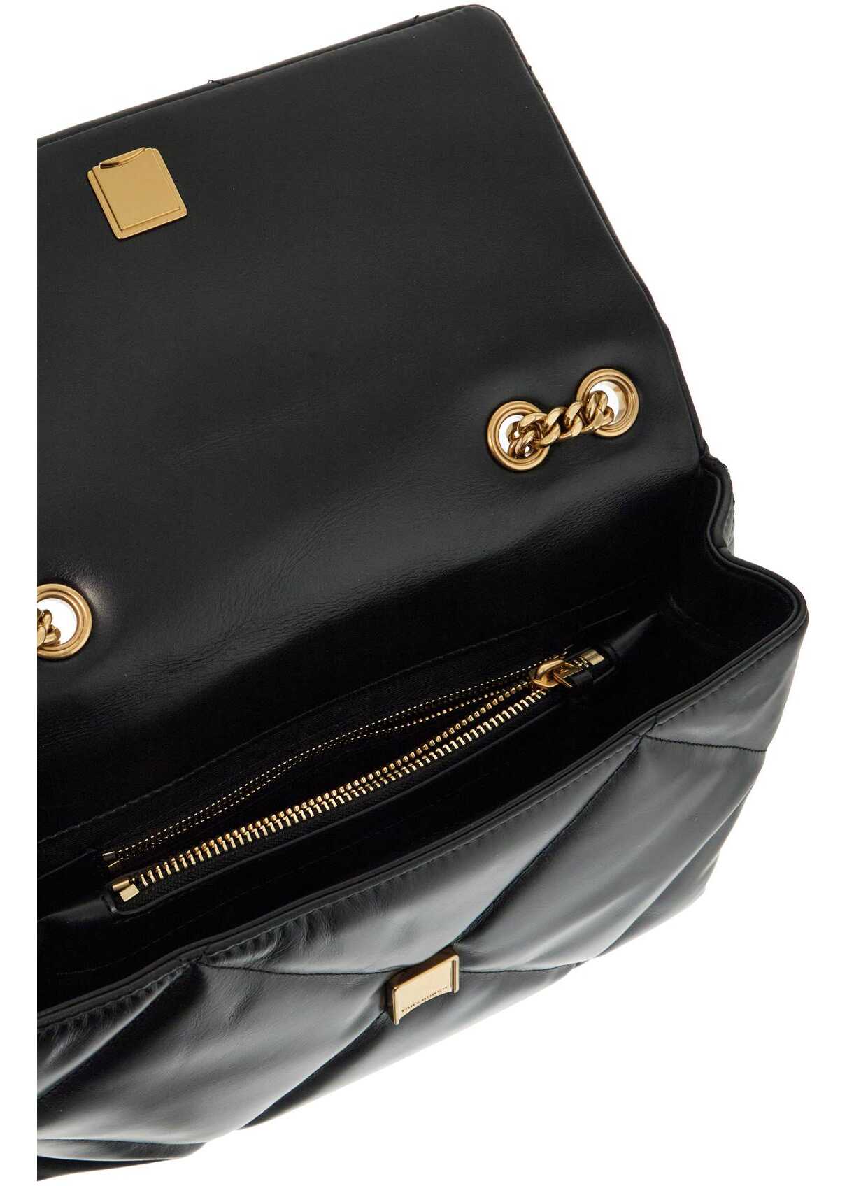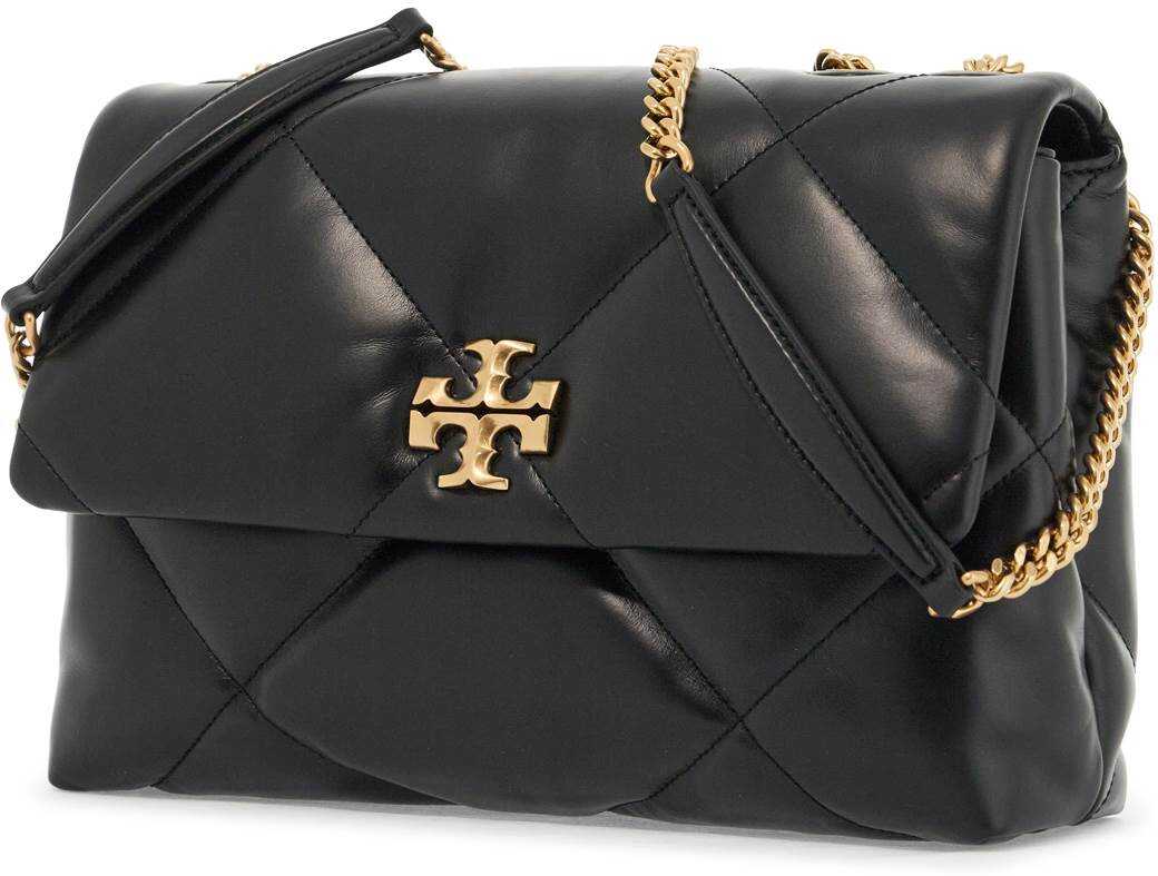 The Kira shoulder bag by Tory Burch is made of quilted nappa leather with a diamond pattern. The flap has a magnetic closure and is adorned with the iconic double T metal logo on the front. The interior is lined in fabric and features two compartments divided by a zip pocket, two open pockets, and an additional zip pocket. The design can be converted thanks to the chain strap that can be doubled for a shoulder look.