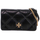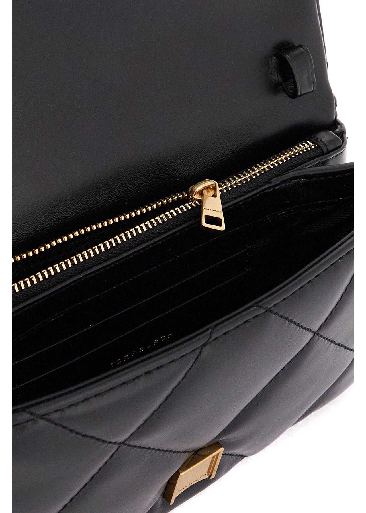 The Kira mini crossbody bag by Tory Burch is made of quilted nappa leather and features a double T metal detail on the front. It has a magnetic flap closure, a grosgrain-lined interior with one slip pocket, one zip pocket, and a main compartment with two credit card slots. There is also an additional flat pocket on the back and a removable chain shoulder strap. The metallic hardware has a gold finish.