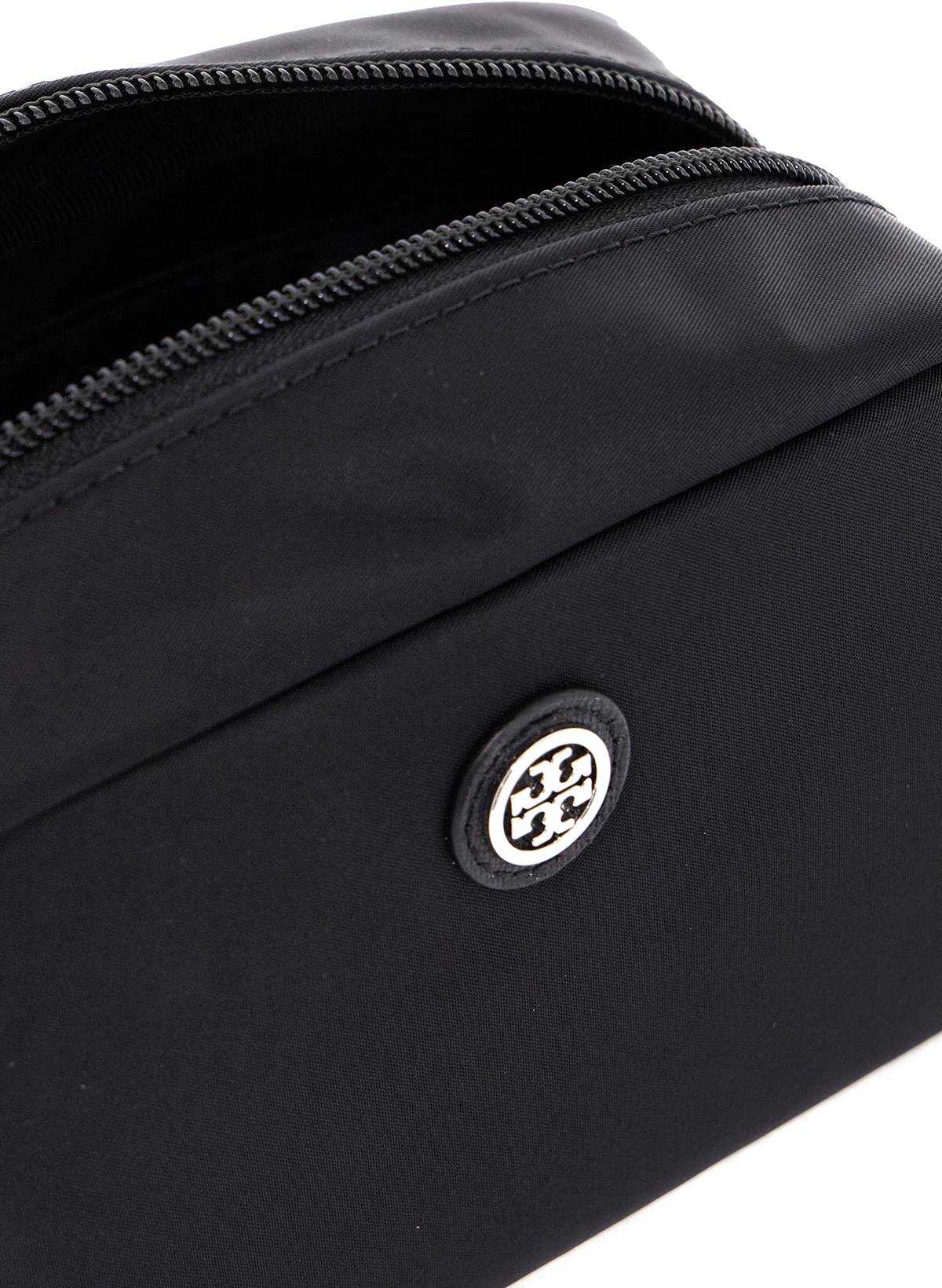 The Virginia beauty case by Tory Burch is made of nylon fabric and detailed with the iconic double T in silver metal, applied on a leather insert. It features a top zip closure and a nylon-lined interior with an open pocket.