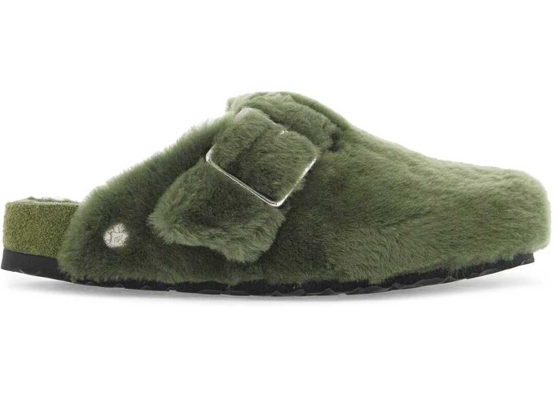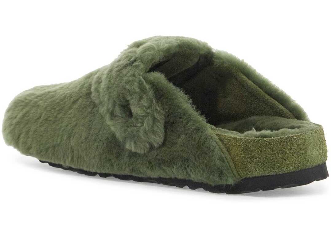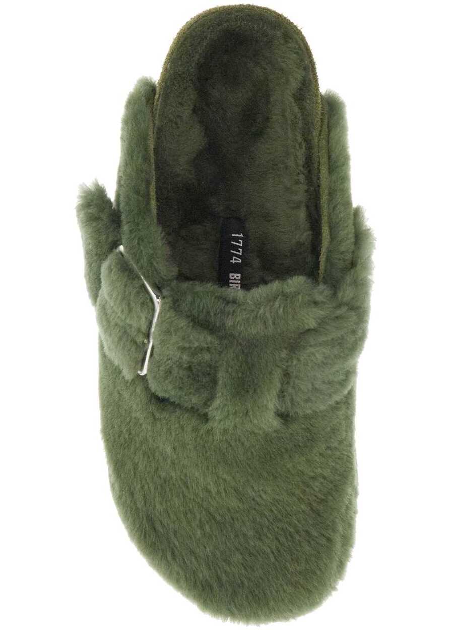 The Boston clogs from the BIRKENSTOCK 1774 collection are made of shearling and come with an adjustable strap featuring a silver buckle engraved with the brand's logo. The anatomically shaped cork and latex footbed is covered in fur, while the sole is crafted from EVA with a cut-out design.