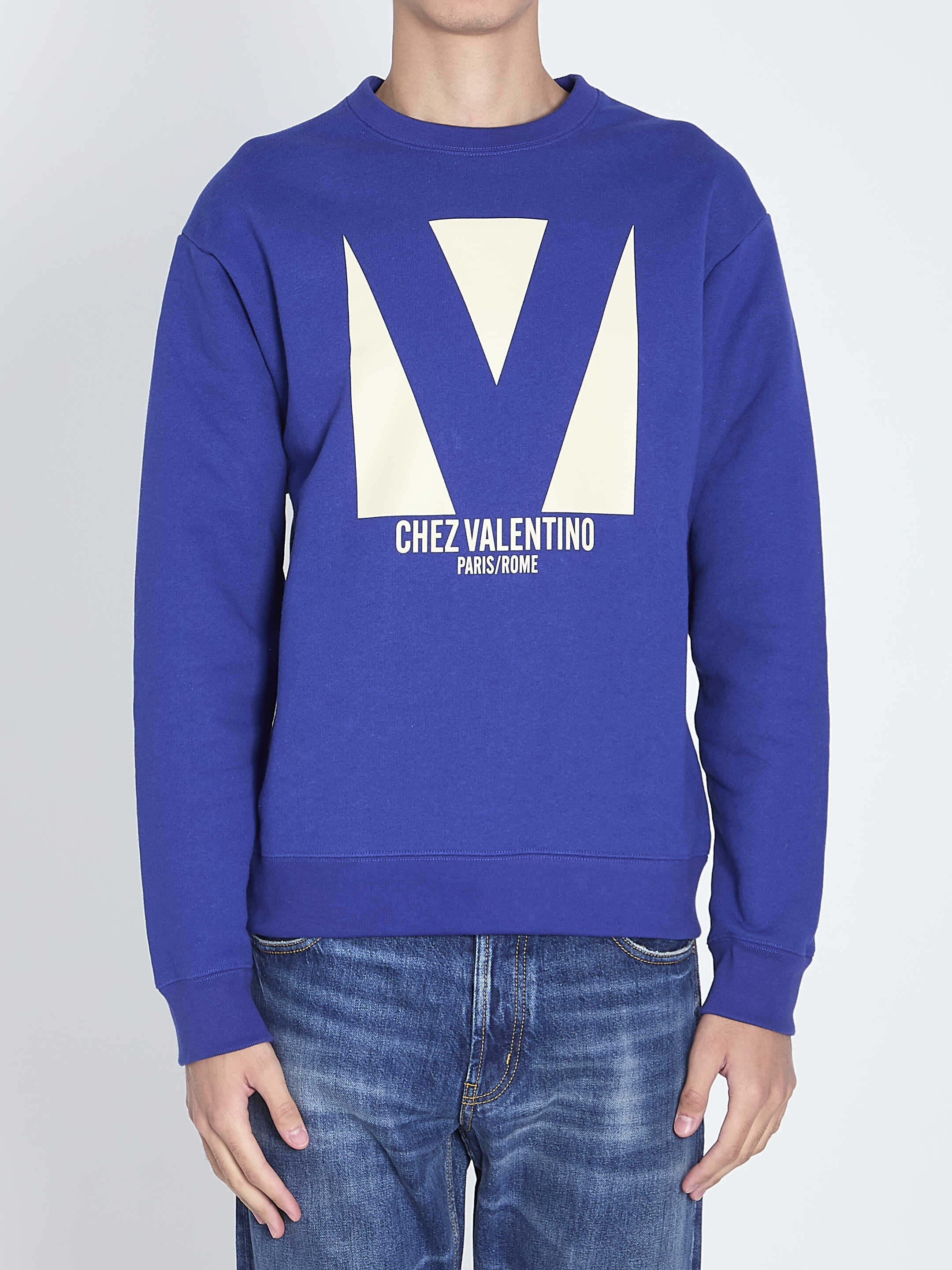Long-sleeved crewneck Valentino sweatshirt in blue cotton with Chez Valentino print on the front. Ribbed collar, cuffs and hem. Regular fit.