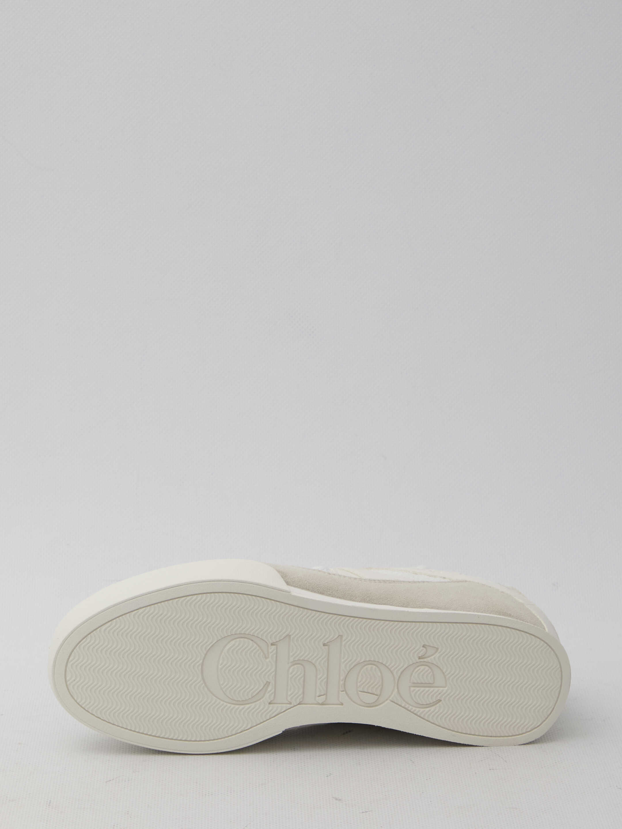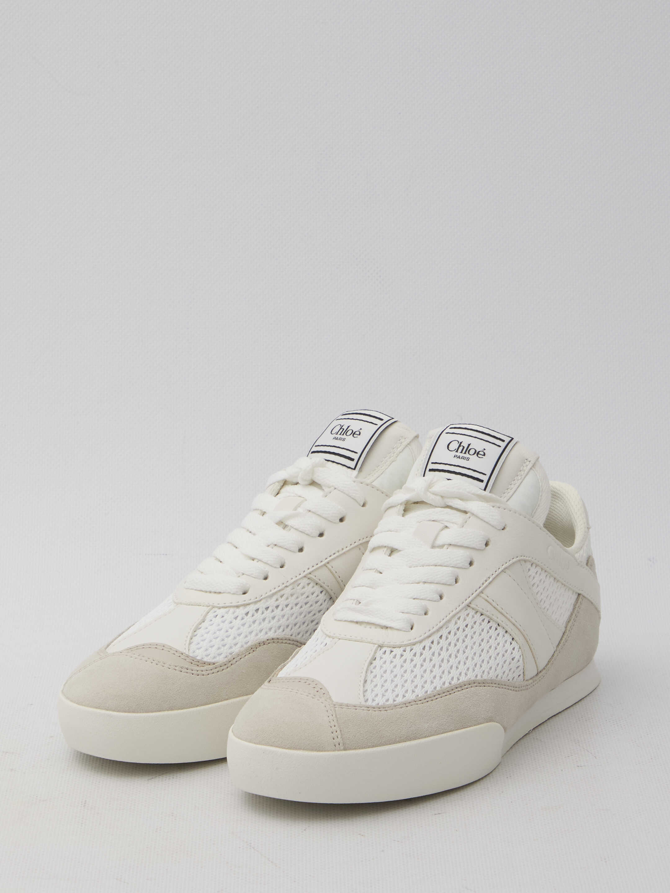 Chloé Kick sneakers in smooth calfskin and suede with recycled mesh inserts in the Cloudy Cream shade. They feature lace-up closure, Chloé label on tongue, embossed Chloé logo on the side and on the back and rubber sole with embossed Chloé logo. Dust bag included. Any leather imperfections are not to be considered manufacturing defects, but a peculiarity of the material.