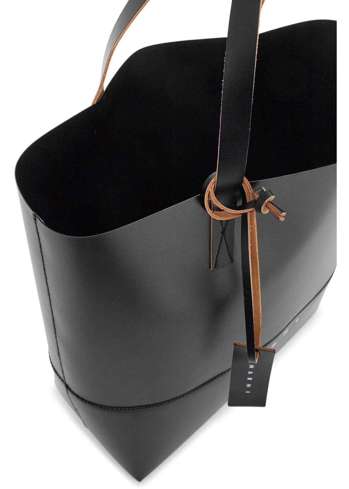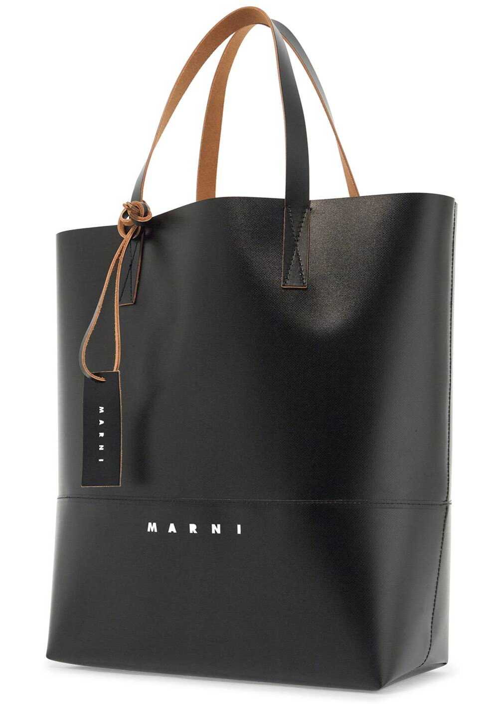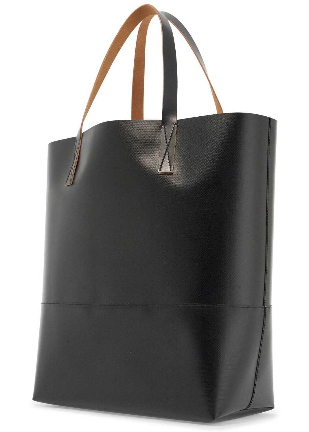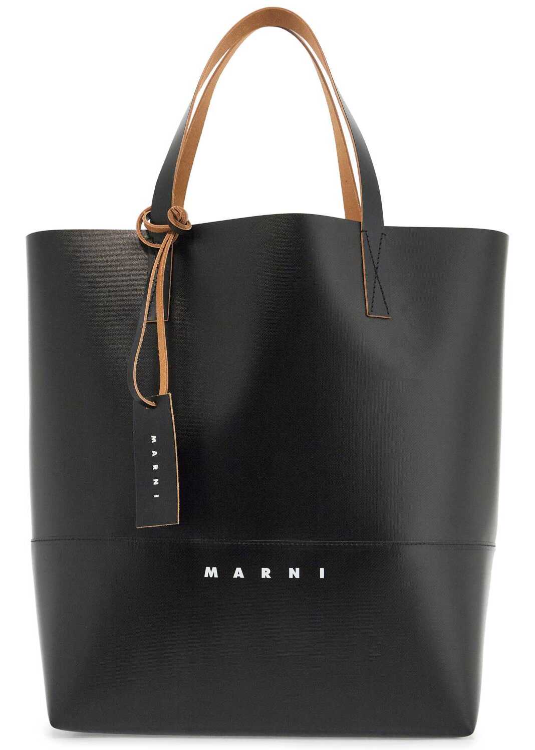 Marni's elongated tote bag, made of smooth faux leather with contrasting edges and a logo print on the front. It features double handles and is embellished with a branded leather tag.