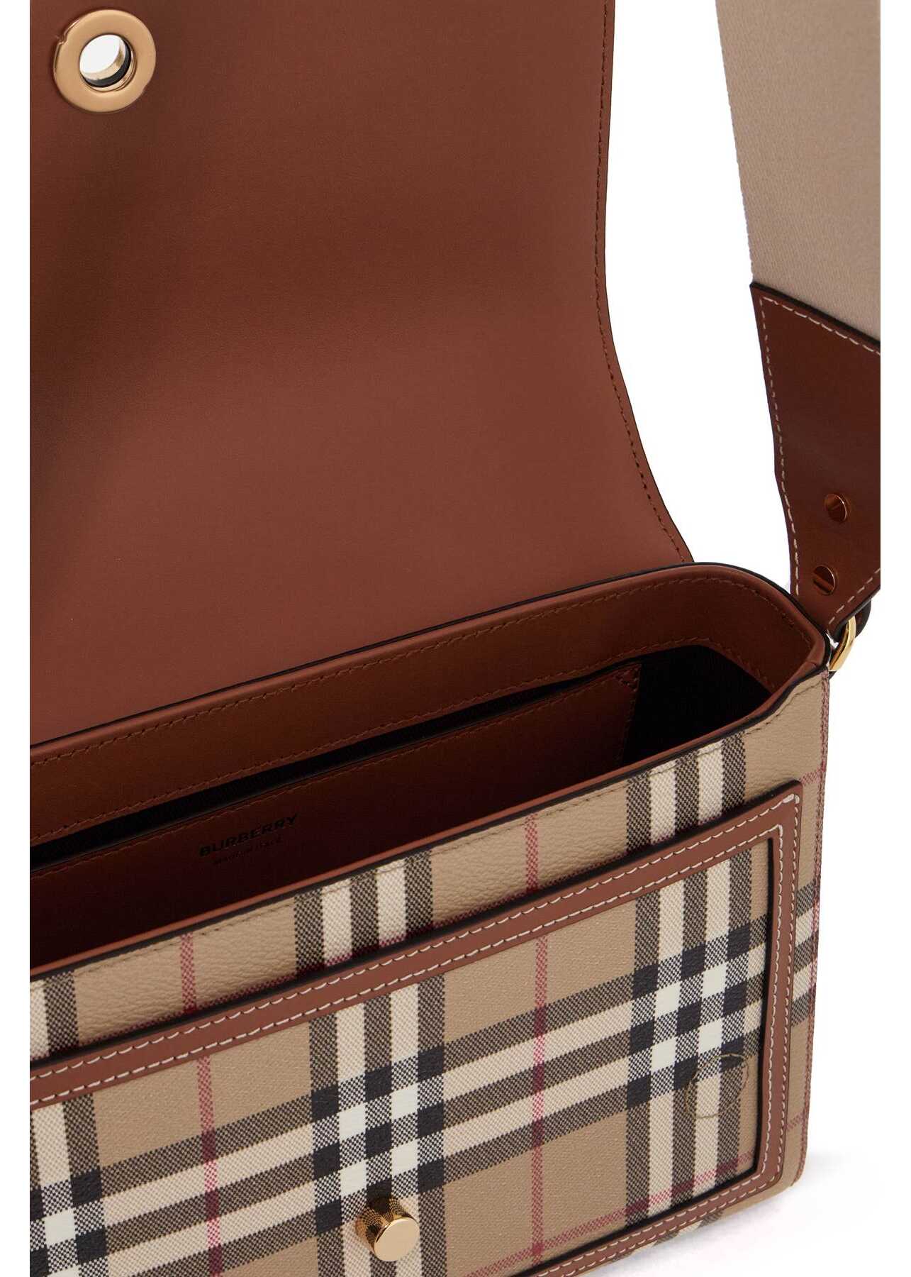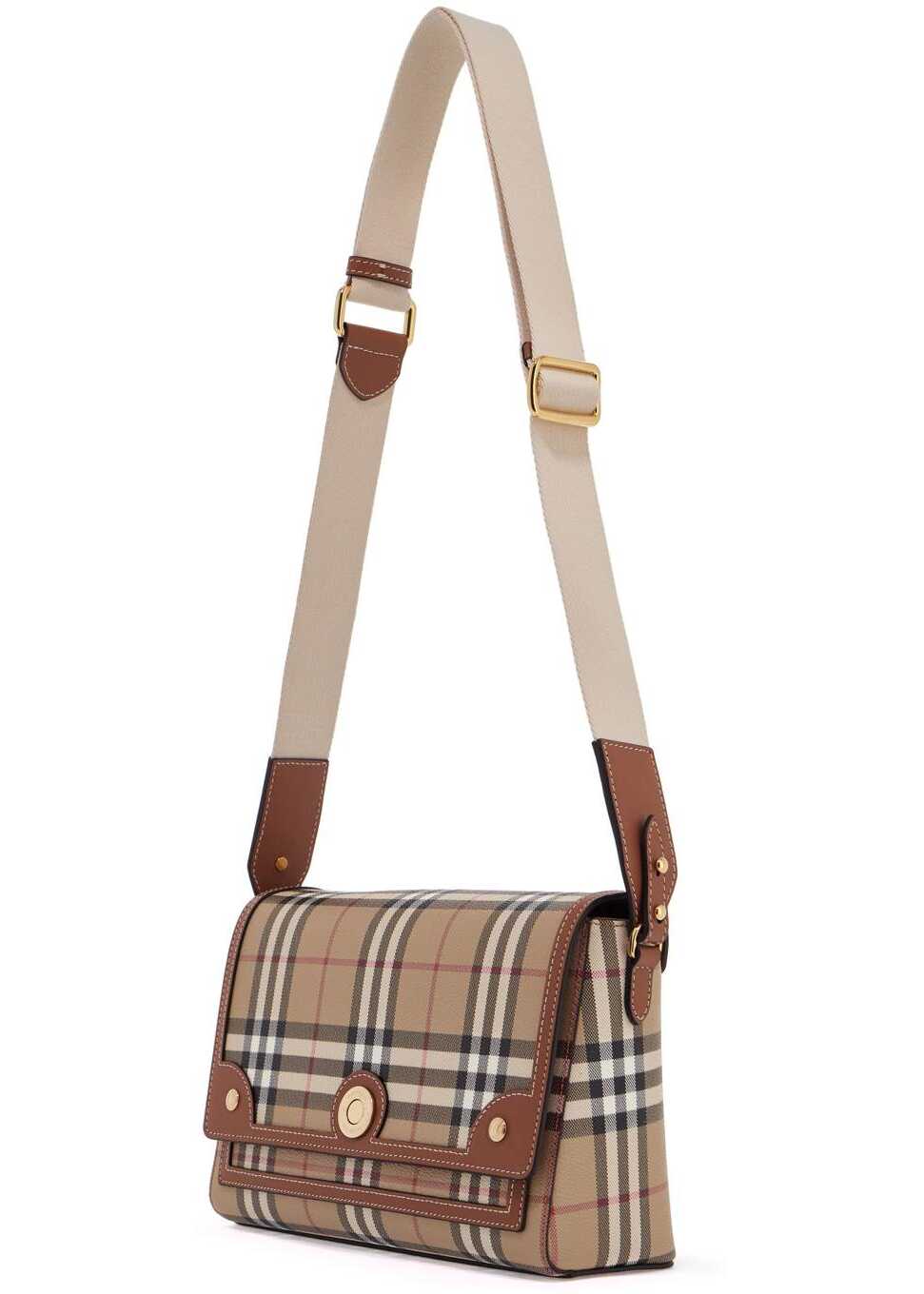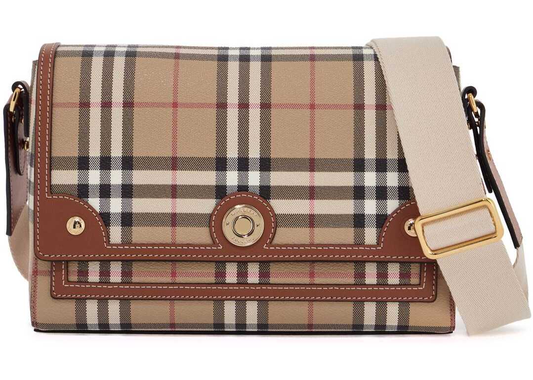 The Burberry Note shoulder bag is made of coated canvas with the iconic Burberry Check pattern and leather trims. It features a magnetic closure, a slip pocket under the flap, and a main compartment lined in cotton with an open pocket. The adjustable and removable ribbon strap and gold-tone hardware add a touch of elegance to this bag.