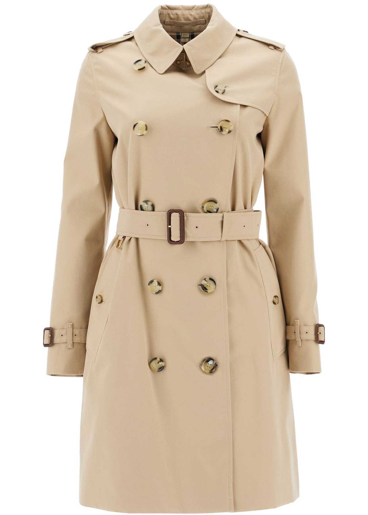 Made as per tradition in rainproof cotton gabardine, the iconic Kensington trench coat comes in a straight silhouette that can be adjusted at the waist with the matching belt. The double-breasted design is finished with set-in sleeves with belted cuffs, shoulder epaulettes, and windbreak flaps at front and back. Functional details include buttoned side pockets, collar hook closure and back vent. Leather-covered buckles add a distinguished note, while the cotton tartan lining signs the garment with a signature touch. The model is 177 cm tall and wears size UK 6.