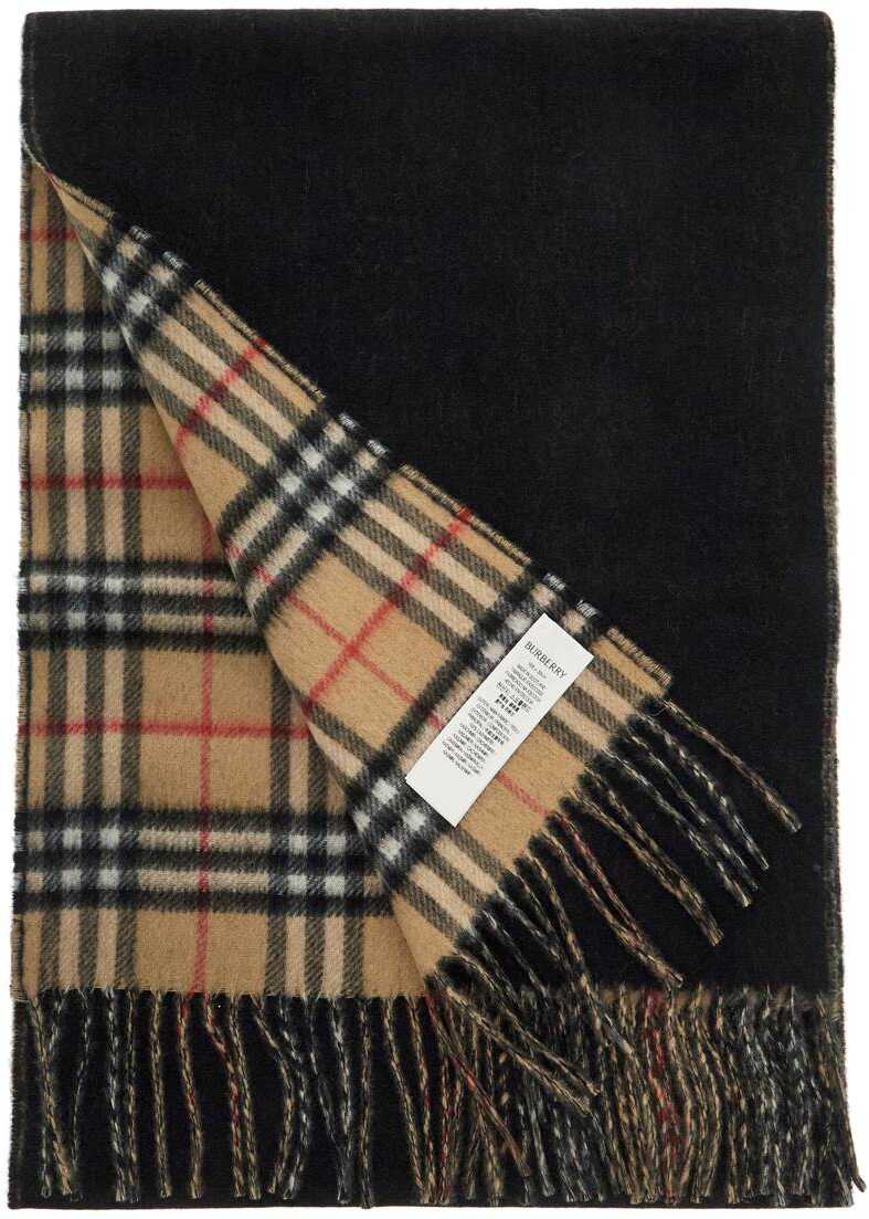 Reversible pure cashmere scarf with one side in a solid color and the other in the iconic Burberry Check. Fringes on the edges.