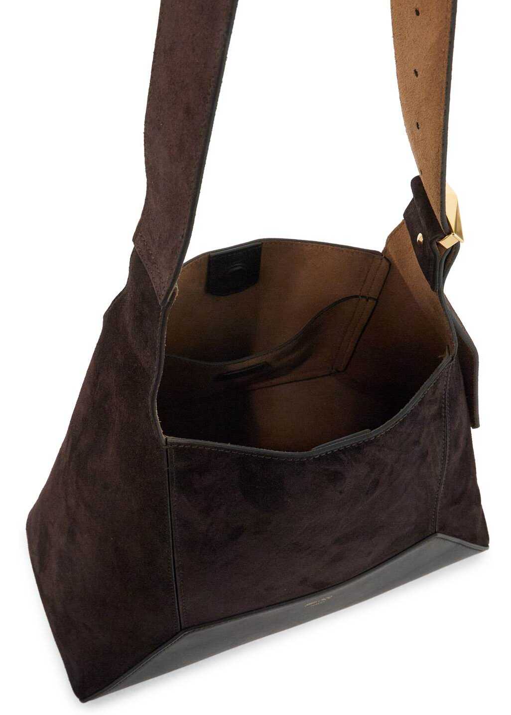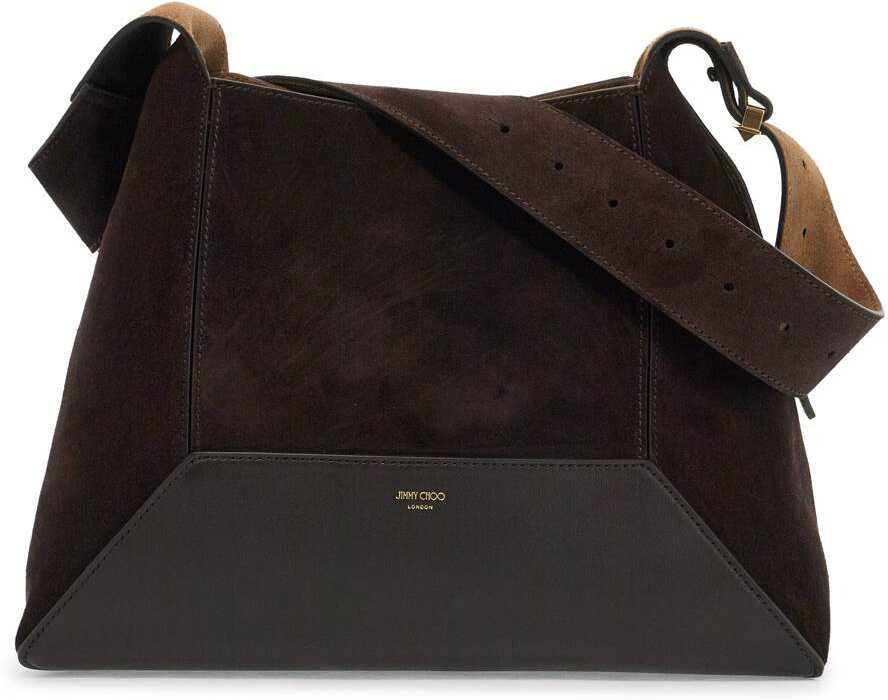 The Jimmy Choo Diamond hobo bag features a panel construction and is made of smooth and suede leather. It has a magnetic closure, an unlined interior with an open pocket, and an unlined handle with a gold metal Diamond buckle.