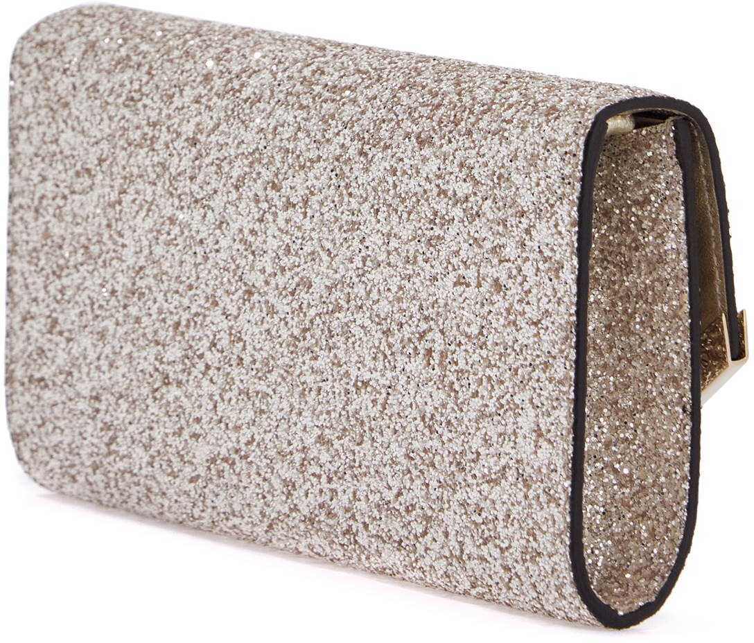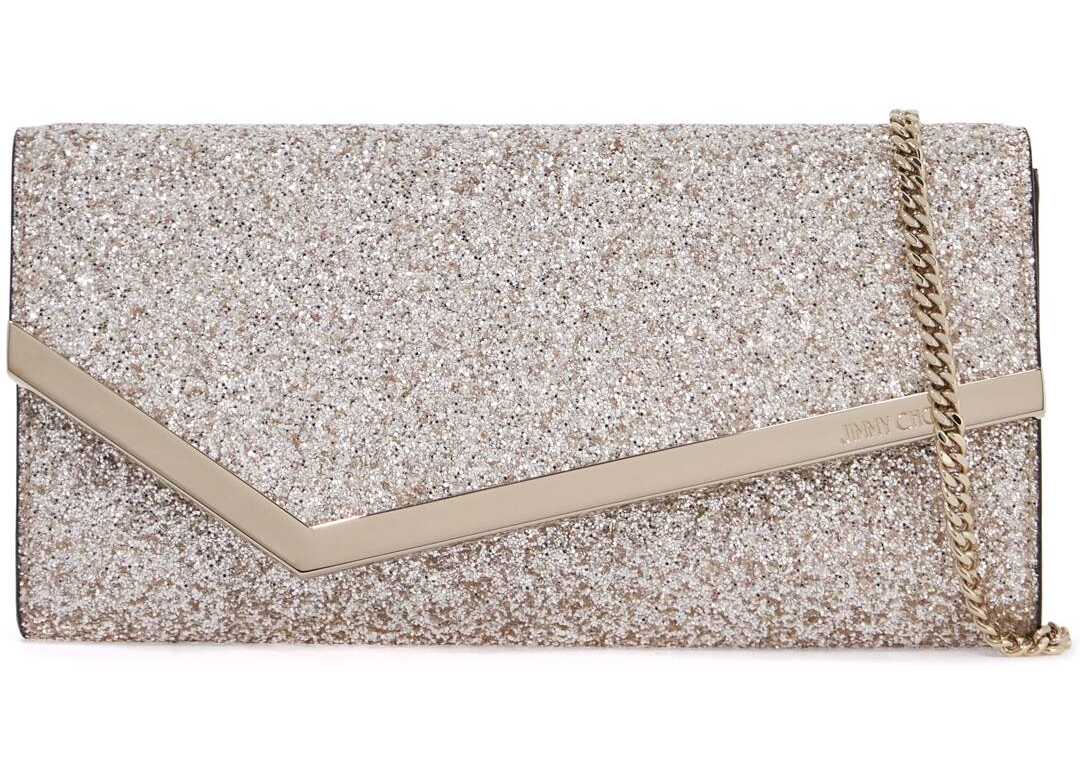 The Emmie clutch by Jimmy Choo is covered in glitter and features an asymmetrical flap with a metal trim and engraved logo. It comes with a removable chain strap and a magnetic button closure. The interior is lined with leather and satin, and includes a zip pocket, a slip pocket, and six credit card slots. The metallic accessories have a gold finish.