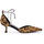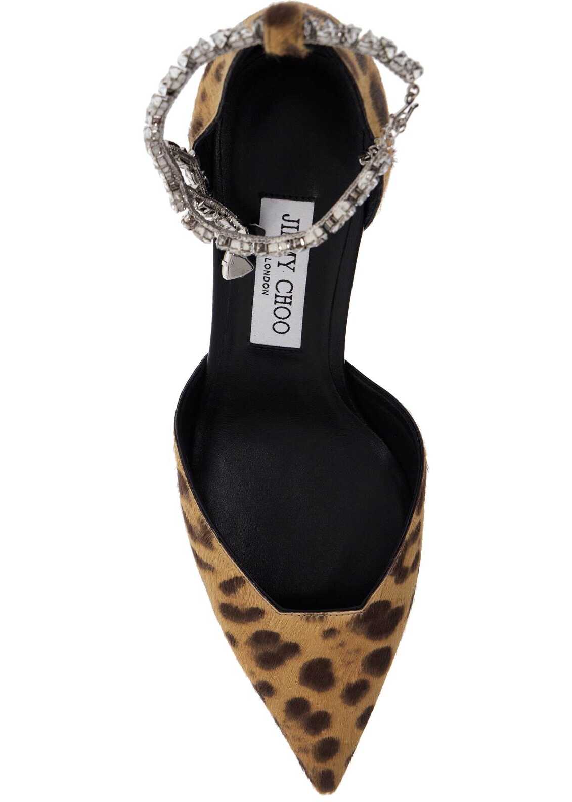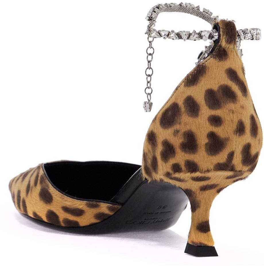 The Stevie Dé colleté by Jimmy Choo is made of animal print pony hair and embellished with a triangular crystal ankle strap. Featuring a pointed toe design with a V-cut, leather insole, covered curved heel, laminated leather sole and rubber insert.