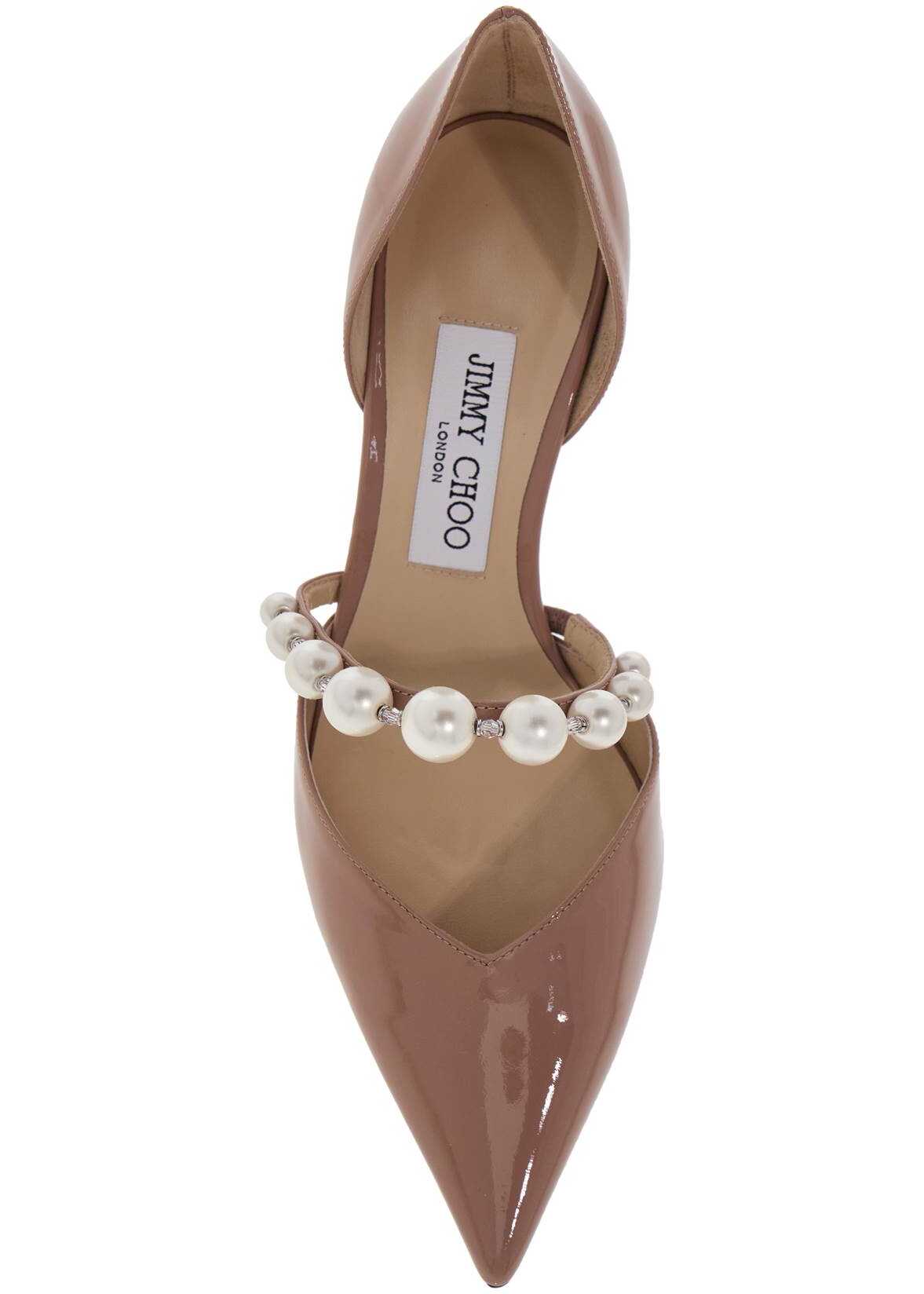 Aurelie décolleté by Jimmy Choo in patent leather. Featuring a front strap with crystals and maxi pearls in various sizes. Pointed closure, stiletto heel. It has a leather interior and a leather sole.