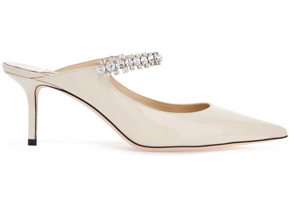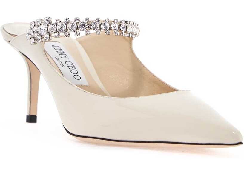 Bing patent mules by Jimmy Choo, decorated with degradé crystals on the front strap. Patent-covered heel, leather lining, leather sole.