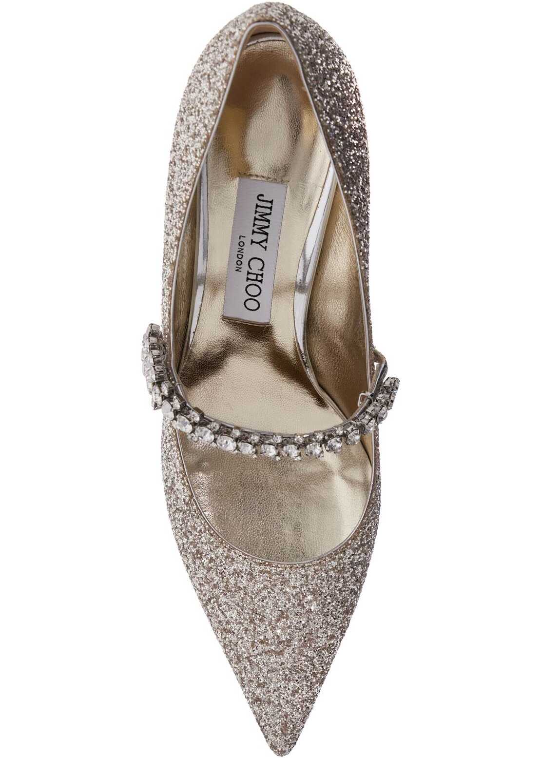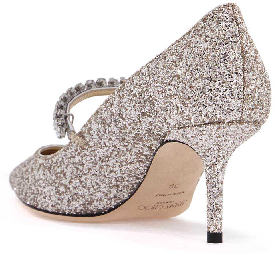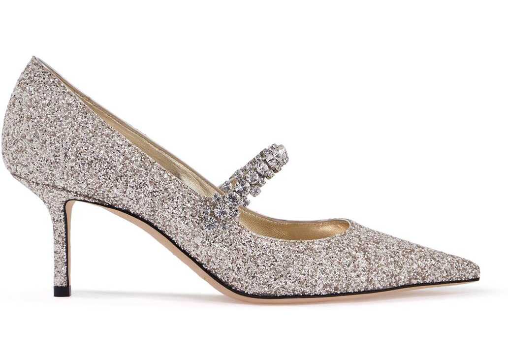 The Jimmy Choo Bing pumps are covered in glitter and embellished with a Swarovski crystal strap. The lining and insole are made of leather with a logo label, and the sole is made of leather as well.
