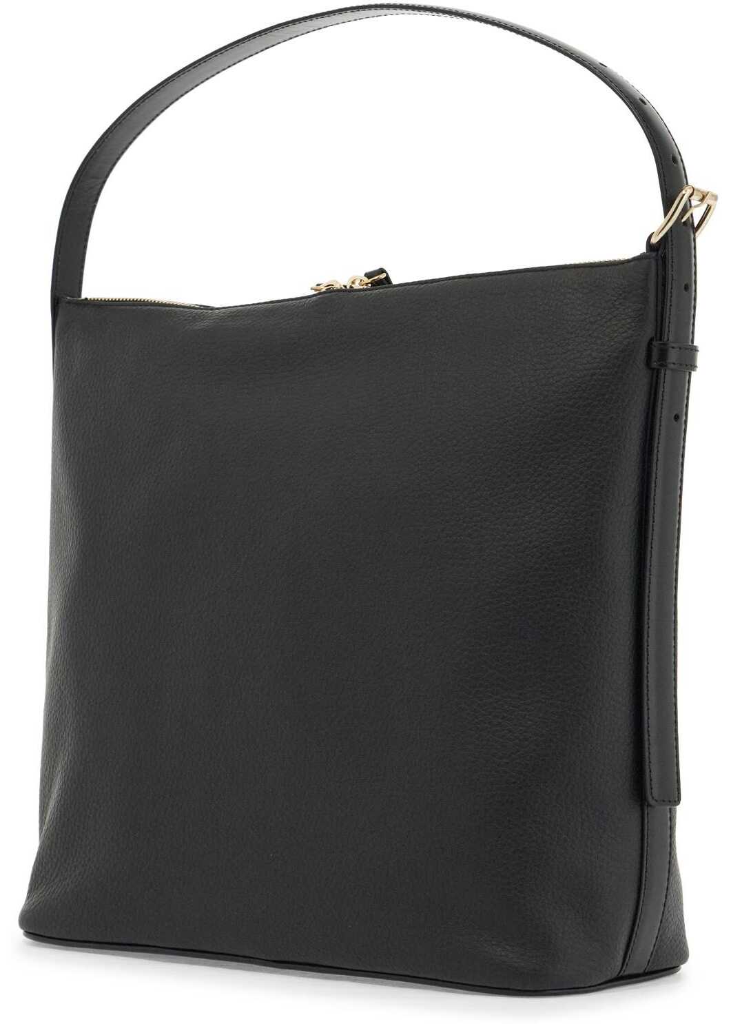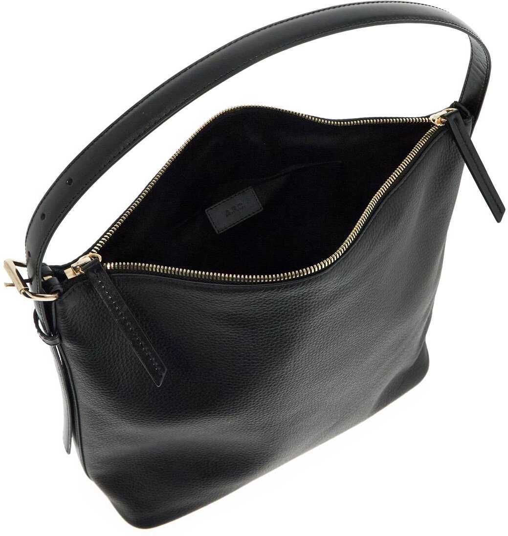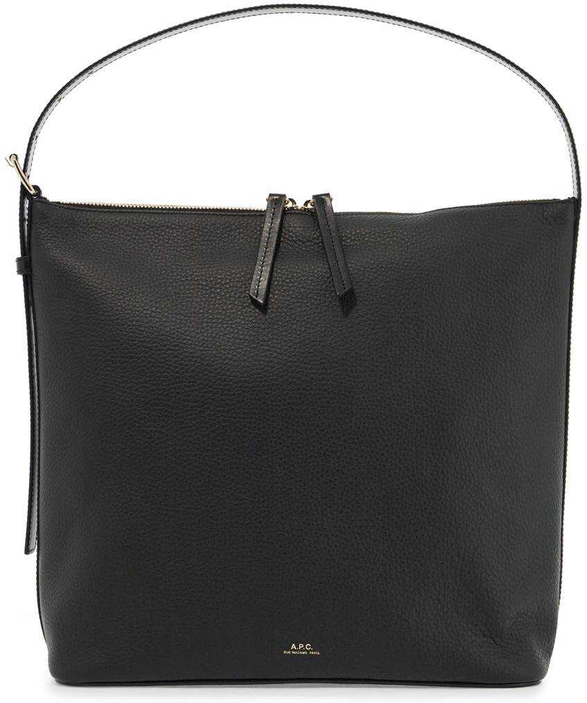 The Vera shoulder bag by A.P.C. is made of hammered leather with a boxy design, featuring a two-way zip closure and a fabric-lined interior with an open pocket and adjustable handle. It is adorned with a small gold lettering logo and finished with palladium hardware.