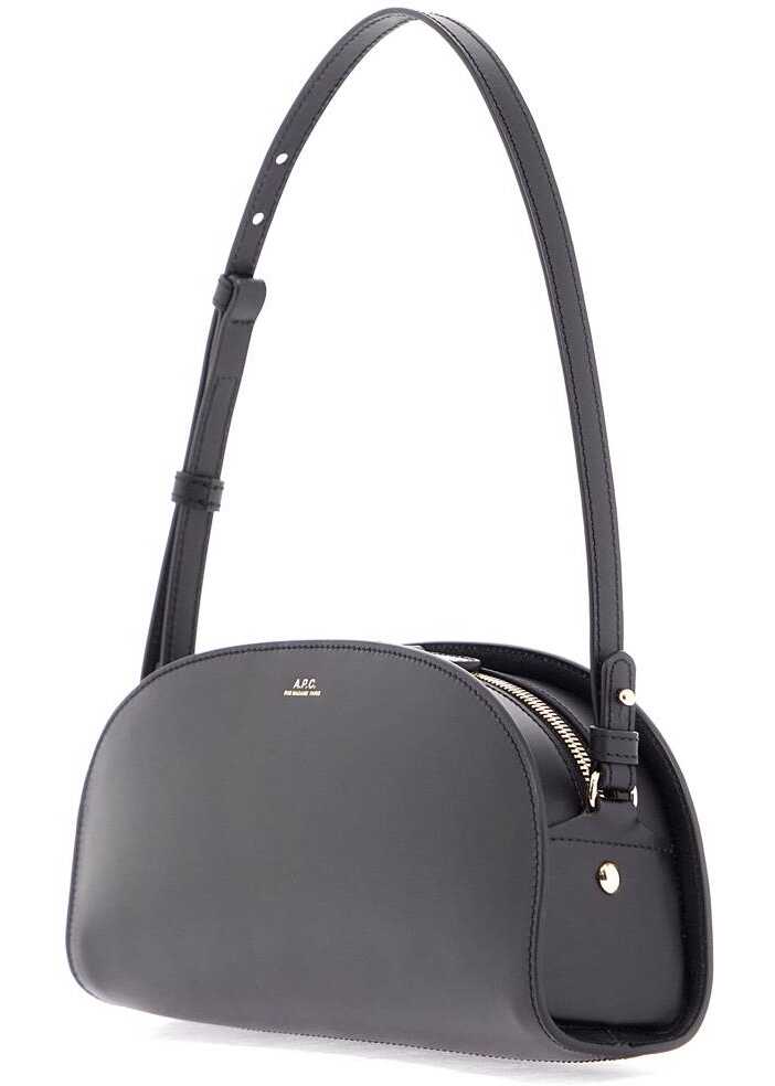 The Demi-Lune shoulder bag by A.P.C. is made of smooth leather with a structured design reminiscent of a half moon. Adorned with a small gold lettering logo on the front, it features a double zip closure, a lined interior with an open pocket, and an adjustable handle.