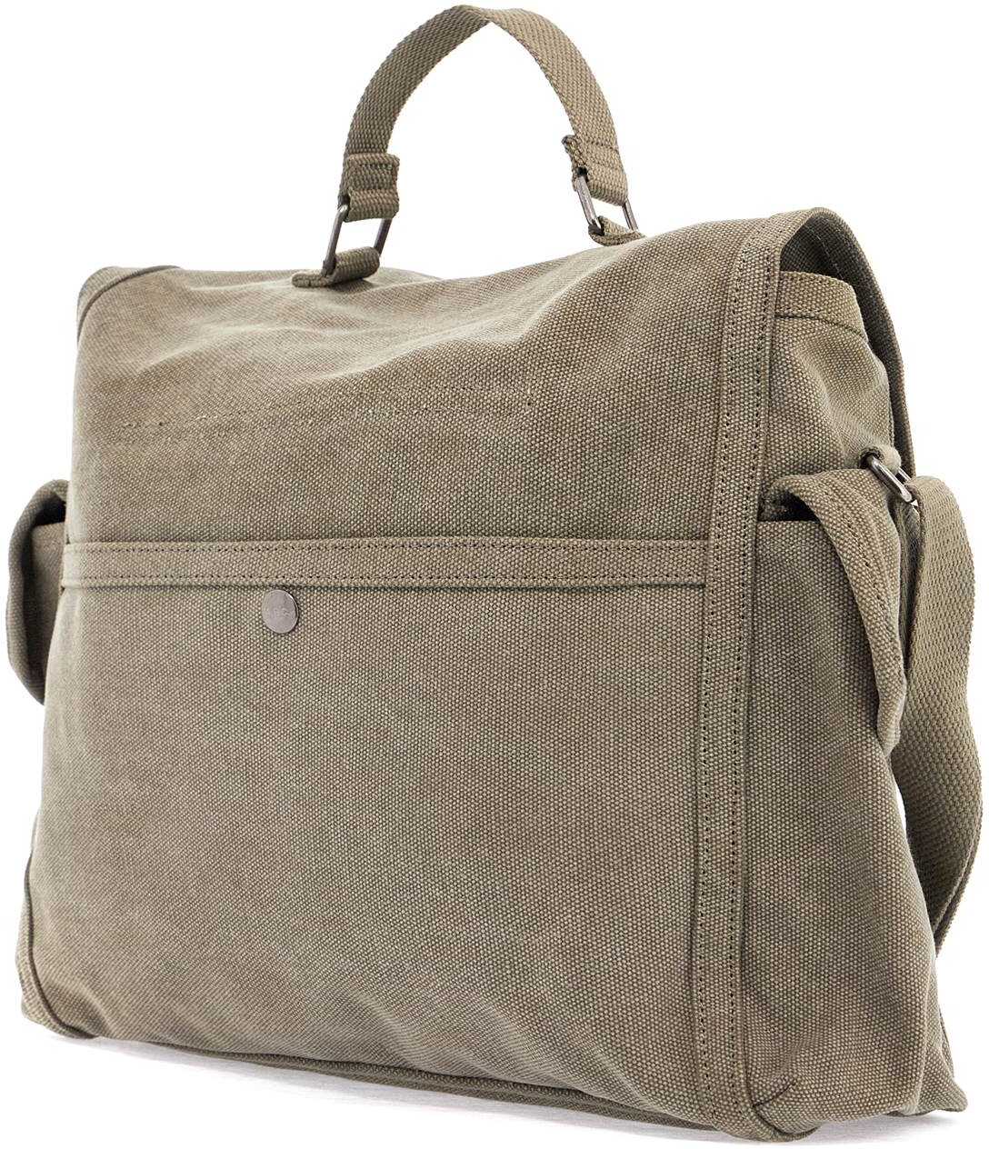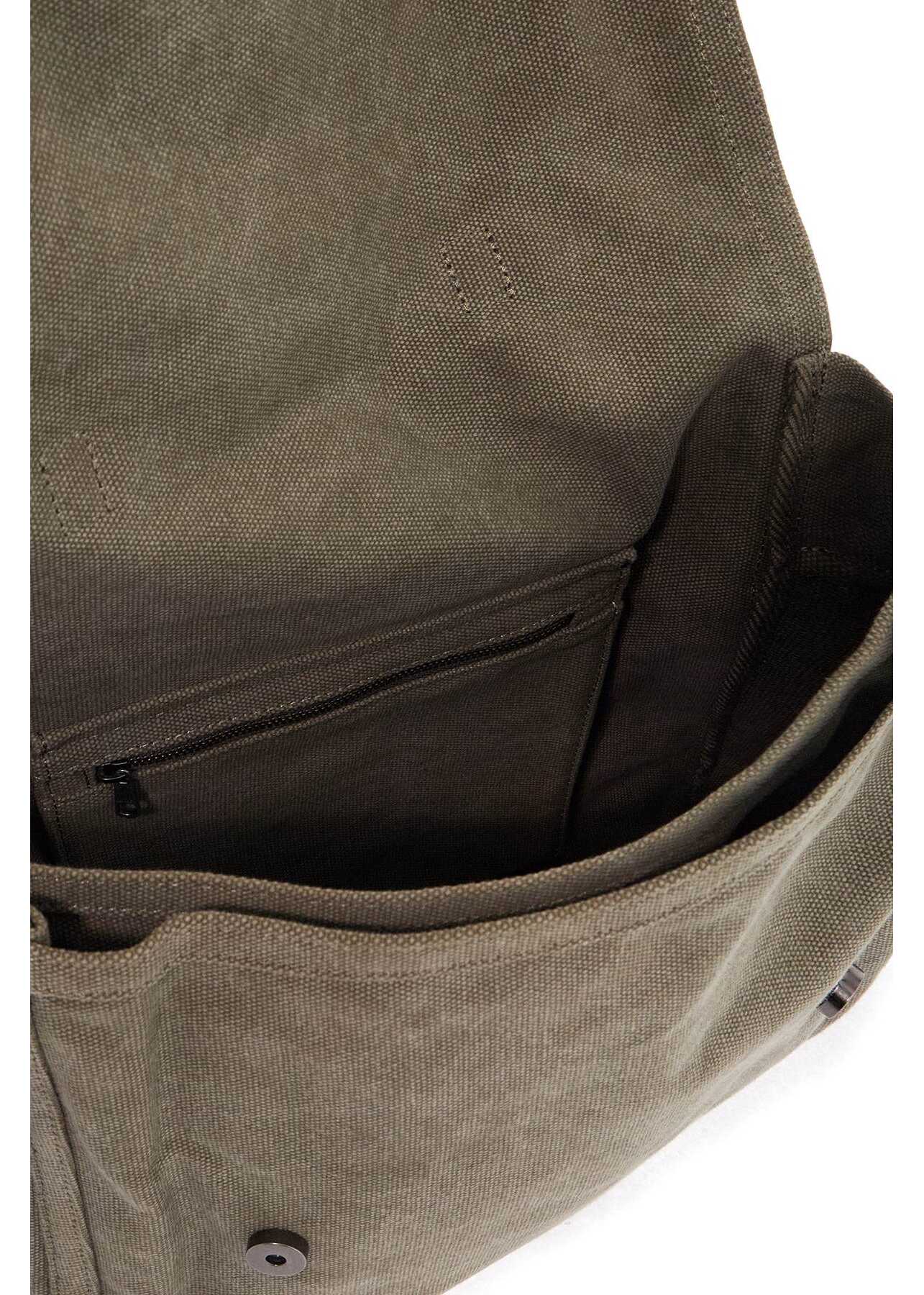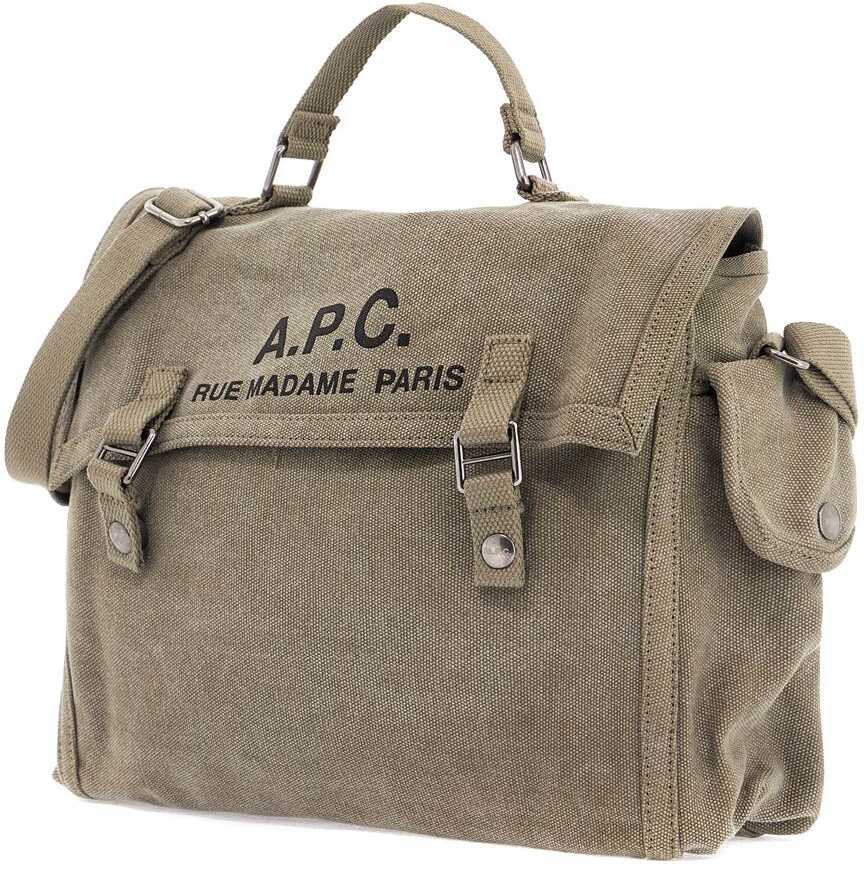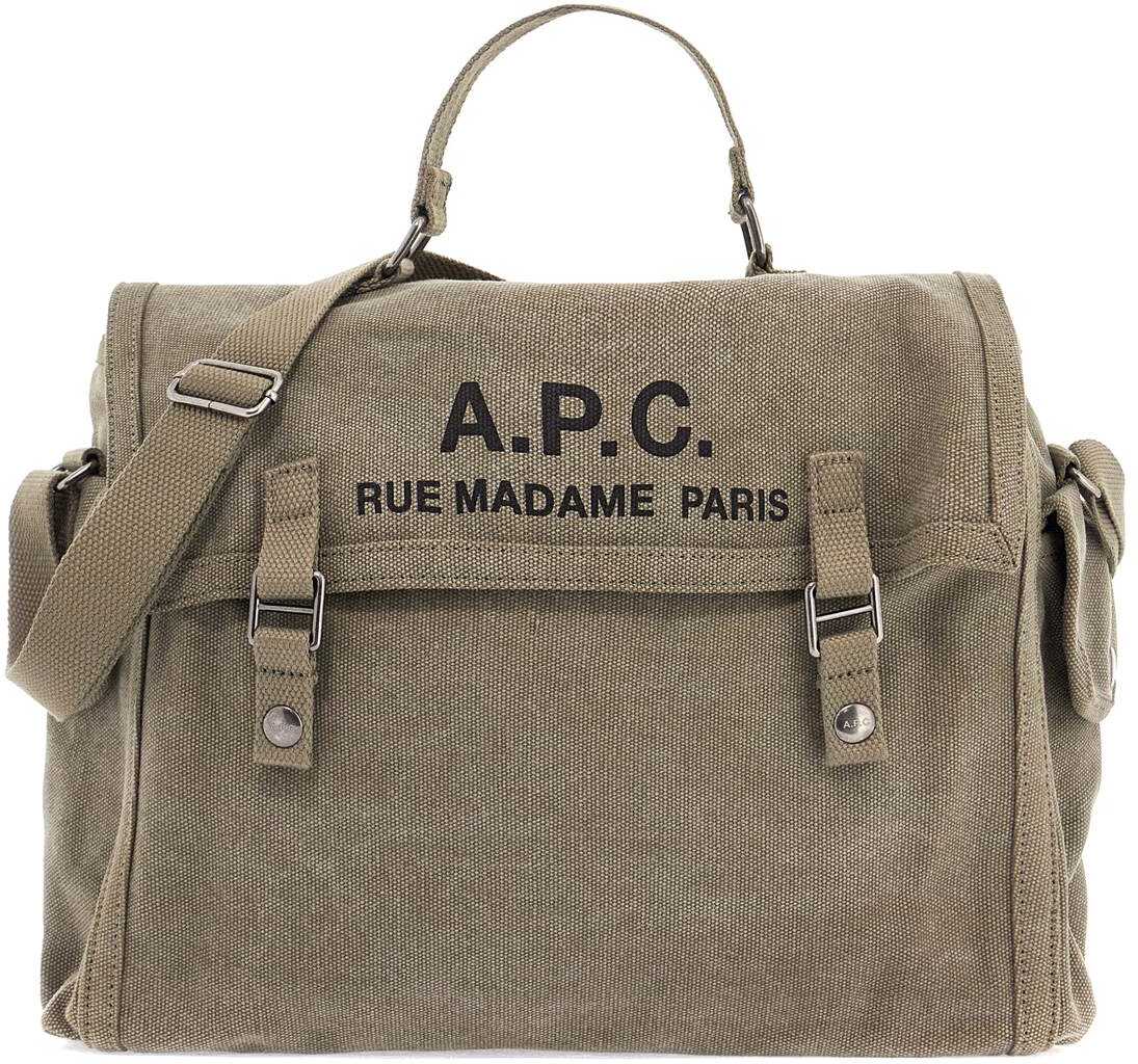 The A.P.C. Recuperation shoulder bag is made of pure cotton canvas with a contrasting logo lettering printed on the flap. It features two magnetic buttons for closure, a main compartment with a zip pocket, an additional compartment under the flap, two side pockets, and one at the back. The design includes a top handle and adjustable shoulder strap. The metallic accessories have a silver finish.