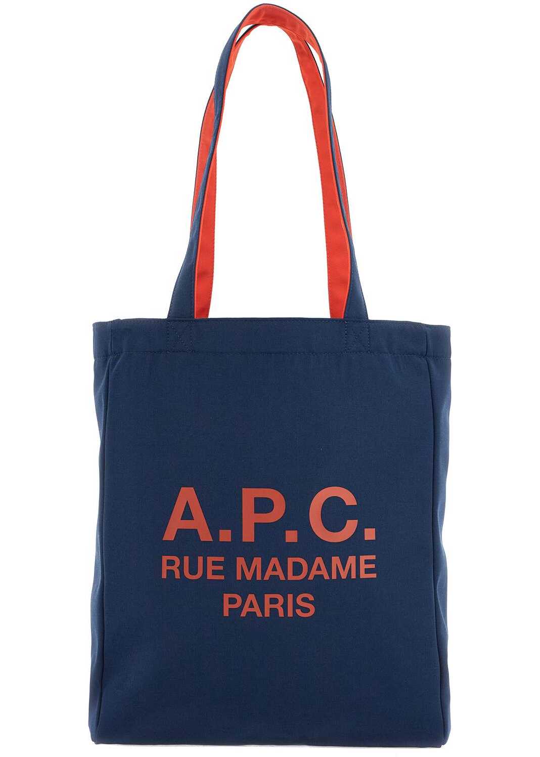 The Lou tote bag by A.P.C. features a reversible design in nylon canvas with contrasting Rou Madame Paris lettering printed on both sides. The interior includes one open pocket and double top handles for easy carrying.