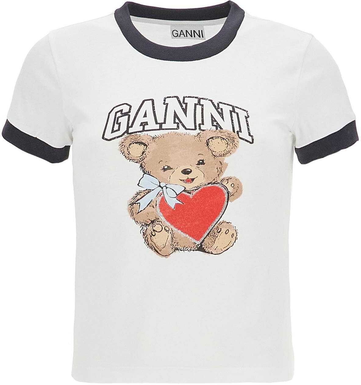 This Ganni T-shirt is made of organic cotton jersey and features a crew neck, micro ribbed edges on the sleeves in contrasting colors, and a graphic Bear print on the front. It has a slim fit and the model is 177 cm tall and wears size XS.