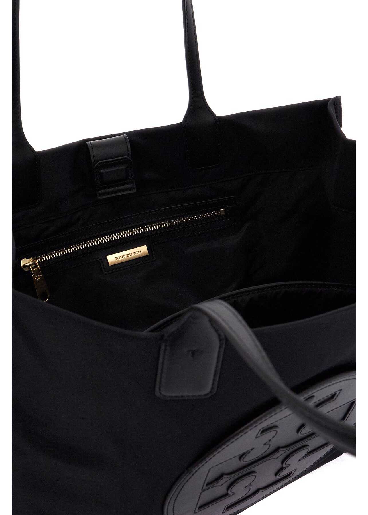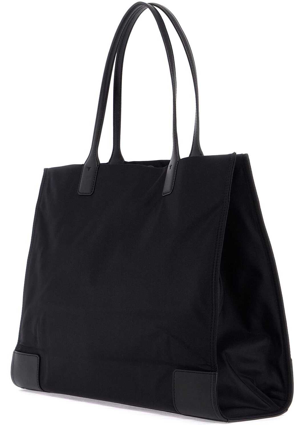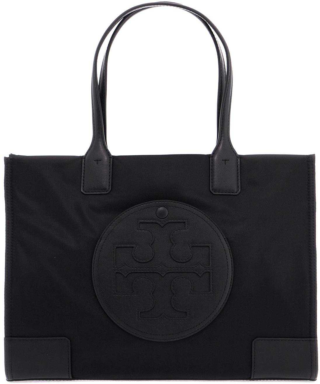 Ella nylon shopping bag featuring double handle, that can be carried by hand or on the shoulder, and faux leather trims. Front double T patch that doubles as a pocket, magnetic closure, side snap buttons, nylon-lined interior with one open pocket and a zippered one. Gold-tone metalware.