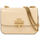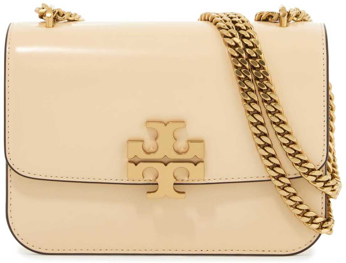 The Eleanor shoulder bag by Tory Burch is made of brushed leather with a Double T in gold metal applied on the flap. It features a magnetic closure, smooth leather interior with one main compartment, a gusseted pocket, a slit pocket and a zippered pocket. The sliding chain strap allows for a versatile double look, while the metallic accessories have a gold finish.