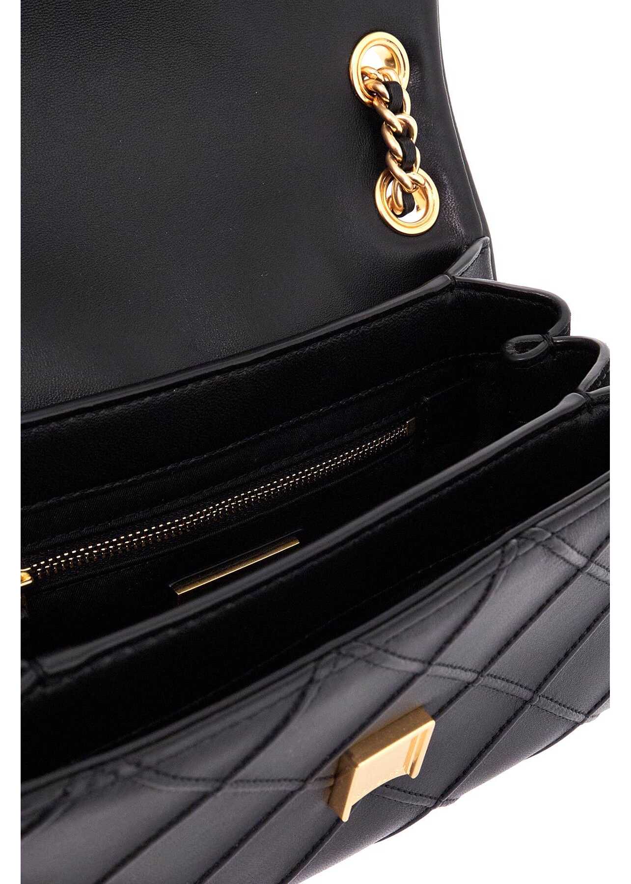 Small Fleming bag by Tory Burch in nappa lambskin with embossed diamond quilting and embossed maxi Double T logo on the top. Sliding leather-woven chain strap to carry on the shoulder or crossbody. Flap with magnetic button closure and fabric-lined interior with a slit pocket, a gusset compartment with a zippered flat pocket and a front pocket with a flat patch pocket. Gold-finished metalware.