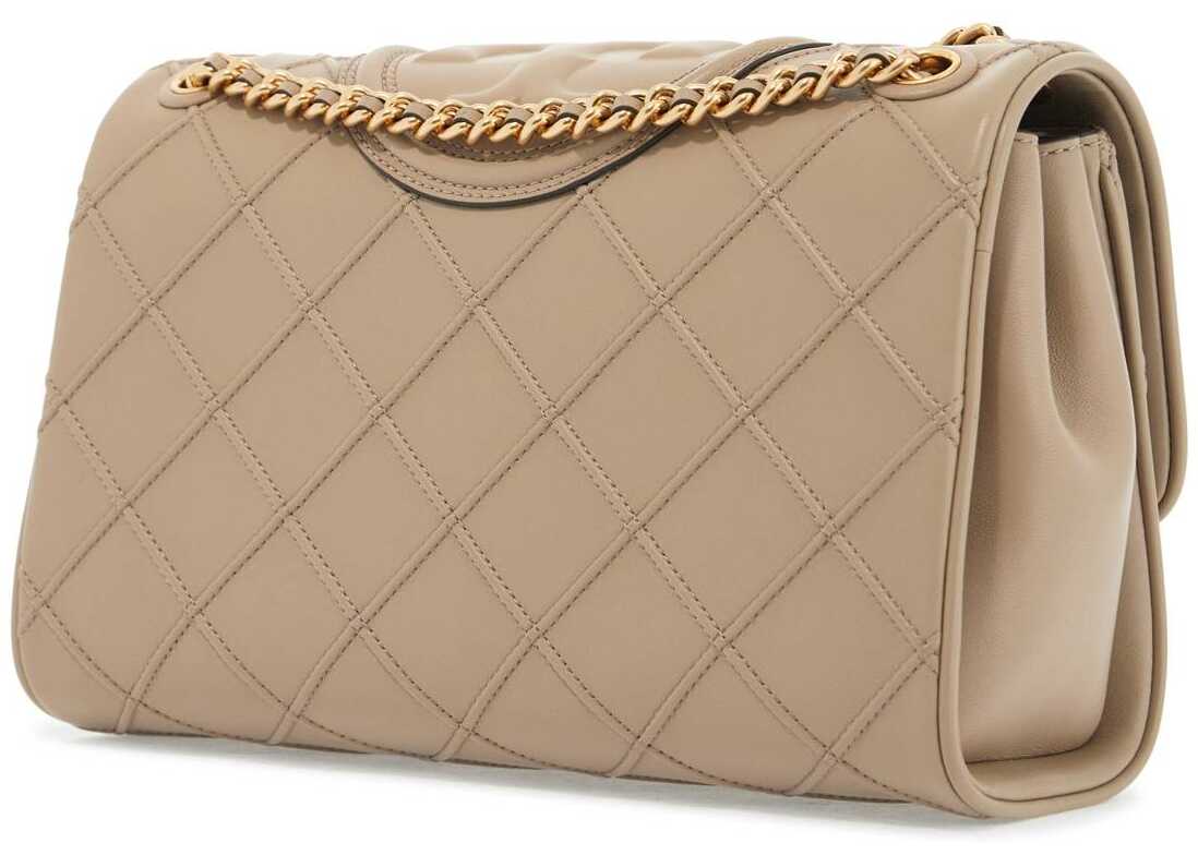 Fleming Soft bag by Tory Burch in nappa leather with embossed diamond quilting and embossed maxi Double T logo on the top. Sliding leather-woven chain strap to carry on the shoulder or crossbody. Flap with magnetic button closure and fabric-lined interior with two main compartments, a zippered flat pocket, a slit one and a flat patch pocket. Gold-finished metalware.