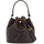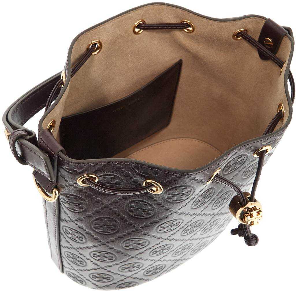 This Tory Burch bucket bag is made of glossy leather with the iconic T Monogram motif printed all over. It features an adjustable handle and a removable, adjustable shoulder strap, as well as a drawstring closure with a branded spring lock. The interior is lined with suede and has a flat pocket. The hardware is in golden brass.