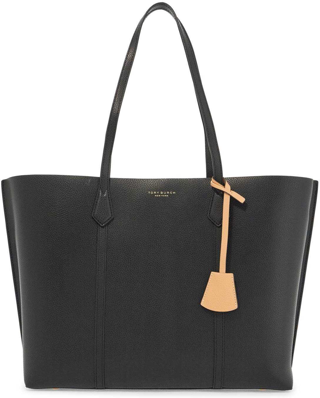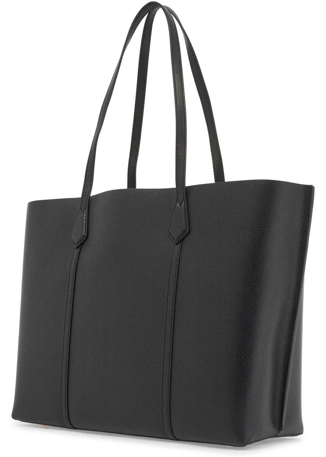 Perry shopping bag by Tory Burch crafted in grained leather with gold-tone lettering logo print on front, removable metal Double T charm with contrasting leather cover and double handle to carry by hand or on the shoulder. Contrasting saffiano-leather interior with two compartments separated by a zipped flat pocket and three patch pockets. Gold-finished metalware and protective studs.