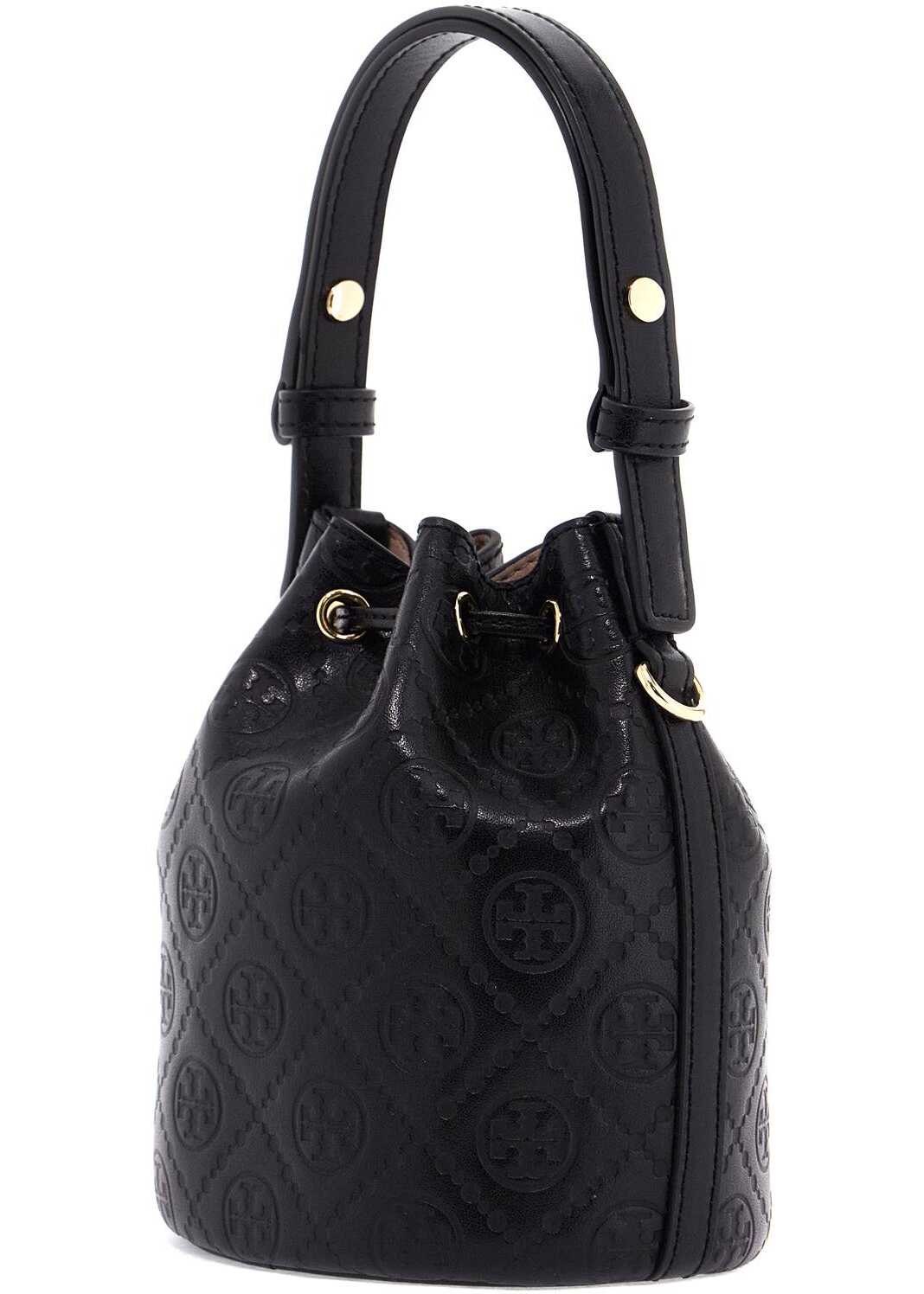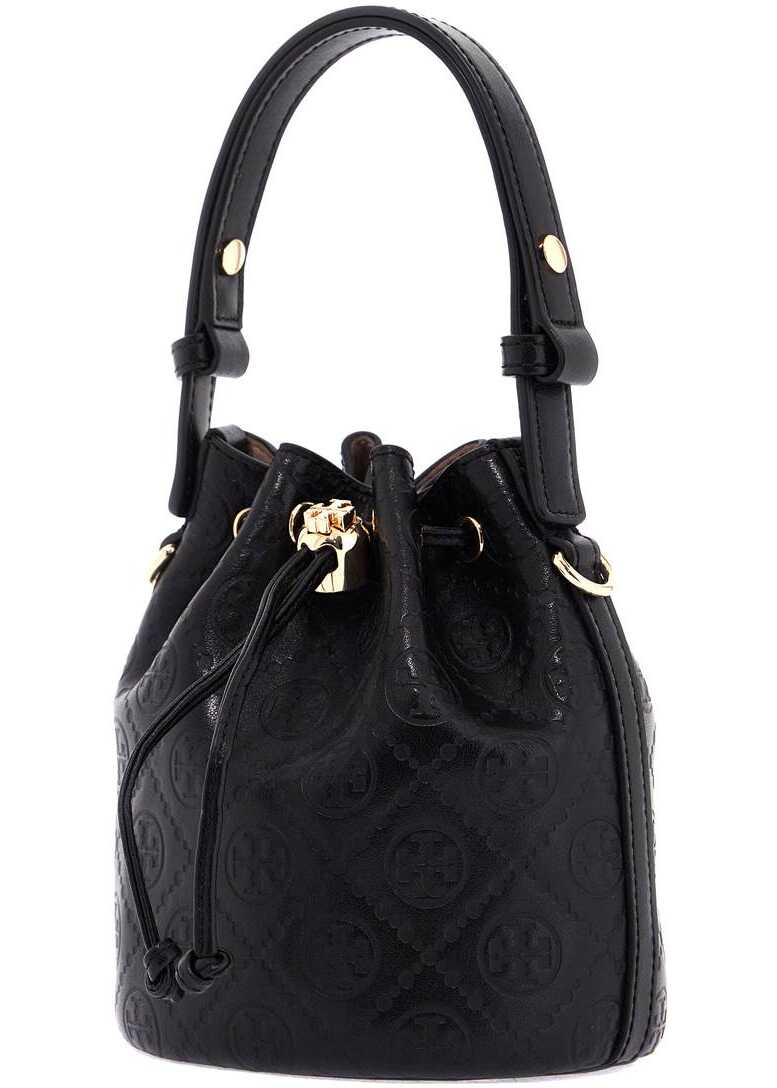 The Tory Burch T Monogram mini bucket bag is made of smooth leather with the iconic Double T motif printed all over. It features a drawstring closure, microsuede interior, adjustable single handle and adjustable shoulder strap. The metallic accessories have a gold finish.