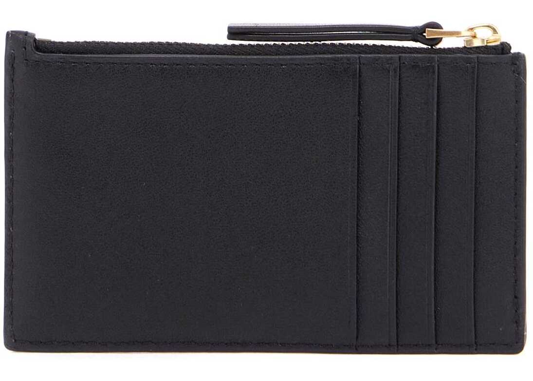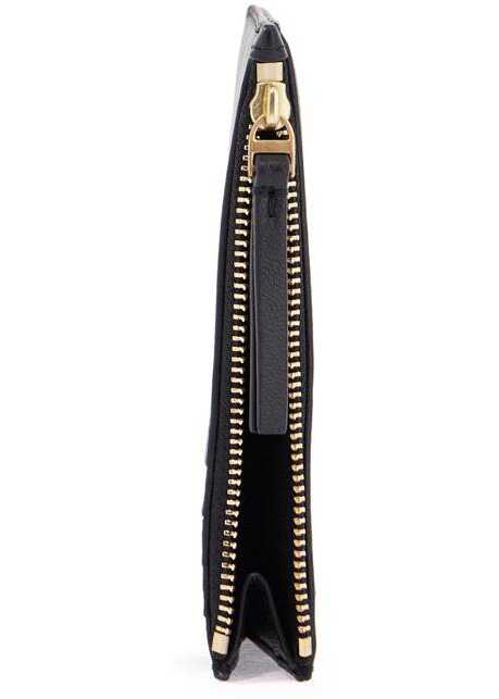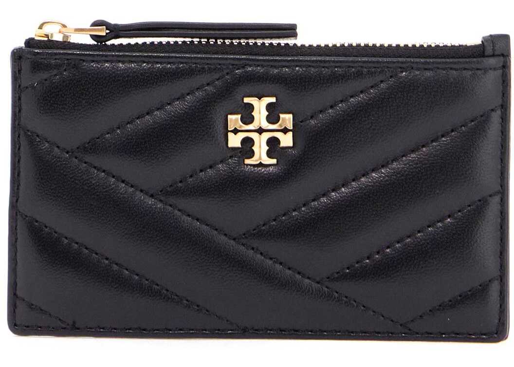 The Kira card holder by Tory Burch is made of soft chevron quilted leather with the classic Double T in gold metal. It features a top compartment with zipper closure and four slots on the back.
