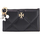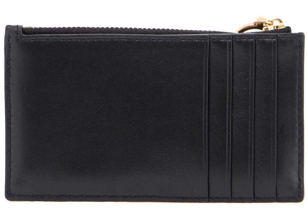 The Kira card holder by Tory Burch is made of quilted leather with diamond stitching and features three hanging charms on the zipper pull. It also has four slots on the back for cards.