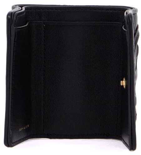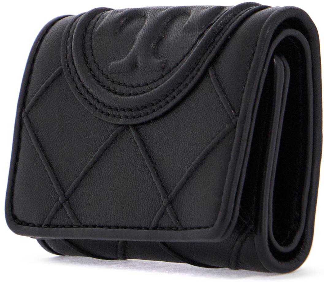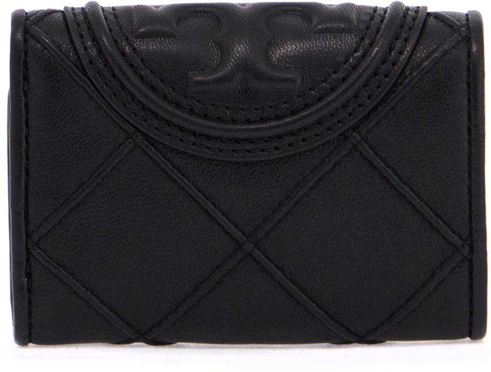 The small tri-fold Fleming wallet by Tory Burch is made of soft quilted diamond-embossed leather and features an oversized Double T logo. It has a snap button closure, a fabric-lined bill compartment, and three credit card slots.