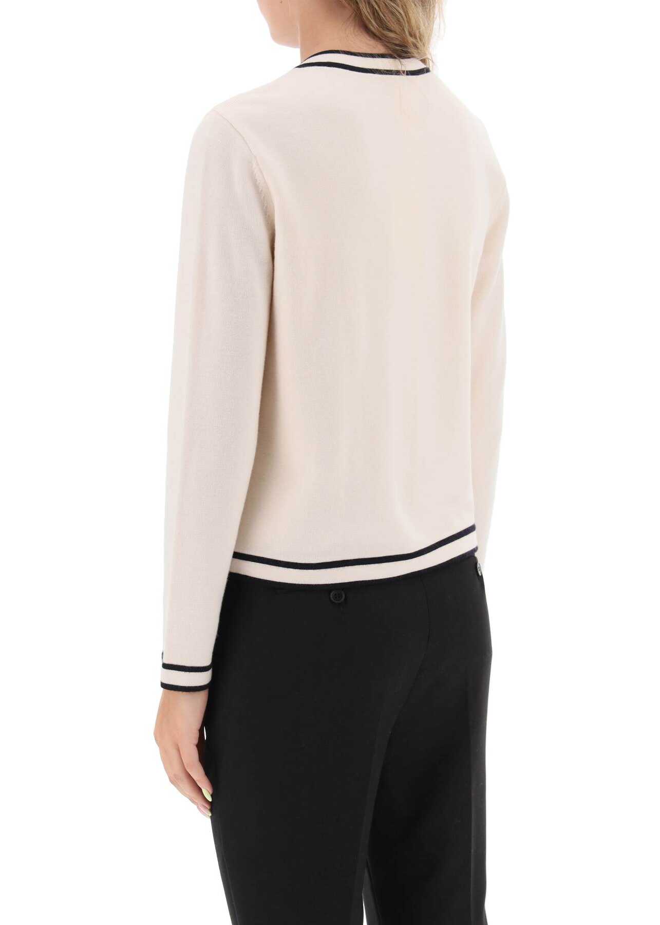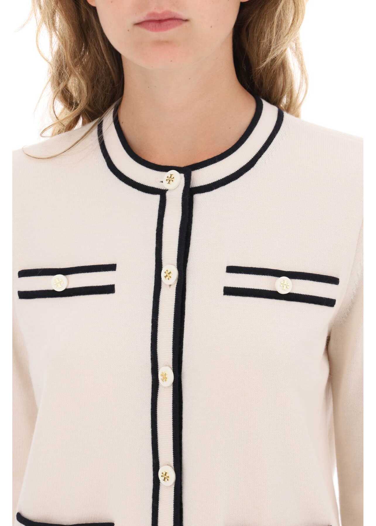 Knitted from combed merino wool, this crew-neck cardigan from Tory Burch is embellished with contrast detailing and logo button closure. Cut to a comfortable, straight silhouette, this piece is designed with two pockets at the bottom, two faux pockets at the chest, and ribbed trims. Monogram lining. Our model is 177 cm tall and wears a size XS.