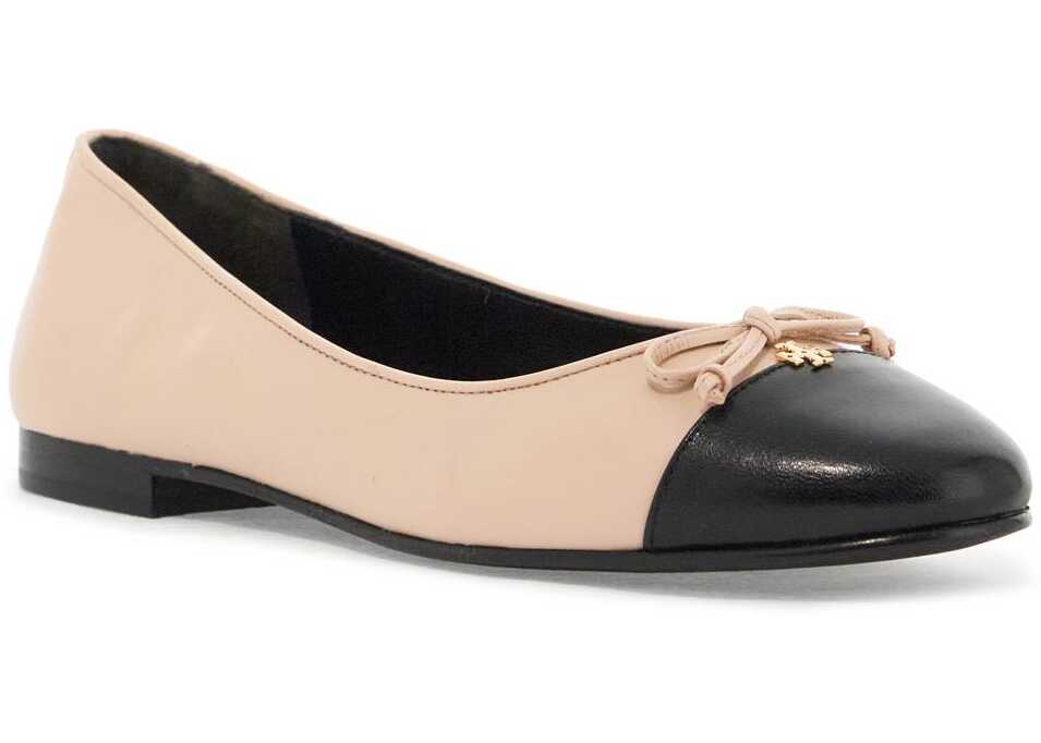 Tory Burch leather ballet flats finished with contrasting toe decorated with a bow and iconic gold-tone metal double-T monogram. Nappa leather lining, lightly padded insole, leather sole.