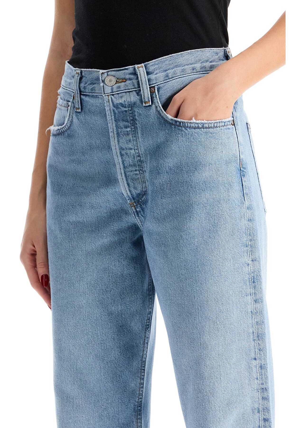 The Kelly jeans by Agolde are made of regenerated denim with a light wash, featuring distressed edges and a high-waisted design with a relaxed straight leg. They have a hidden button closure. The model is 177 cm tall and wears size 26.