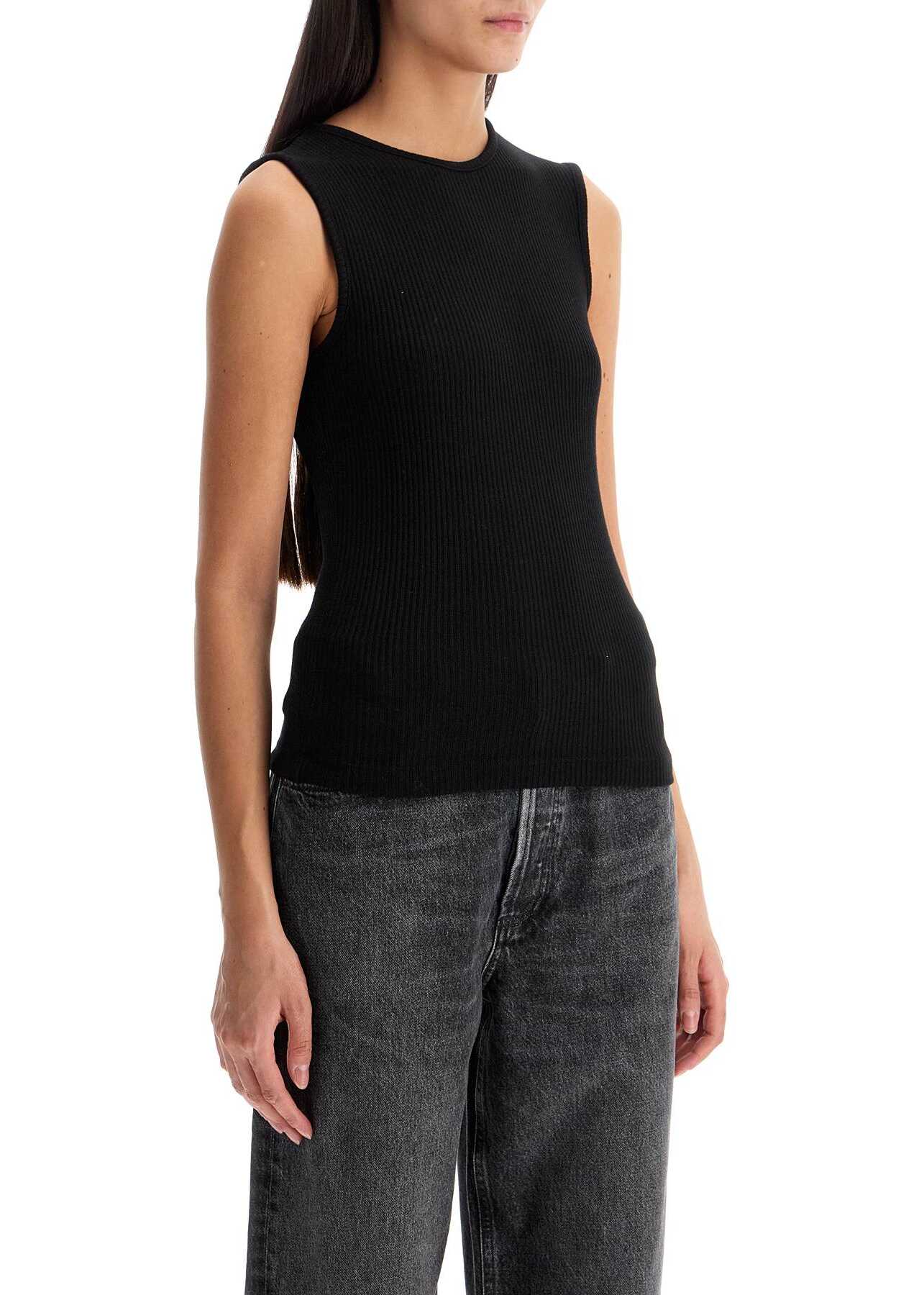 The Binx tank top by Agolde is made of a blend of organic stretch cotton with ribbed texture, featuring a round neckline, wide straps, and a fitted silhouette. The model is 177 cm tall and wears size XS.