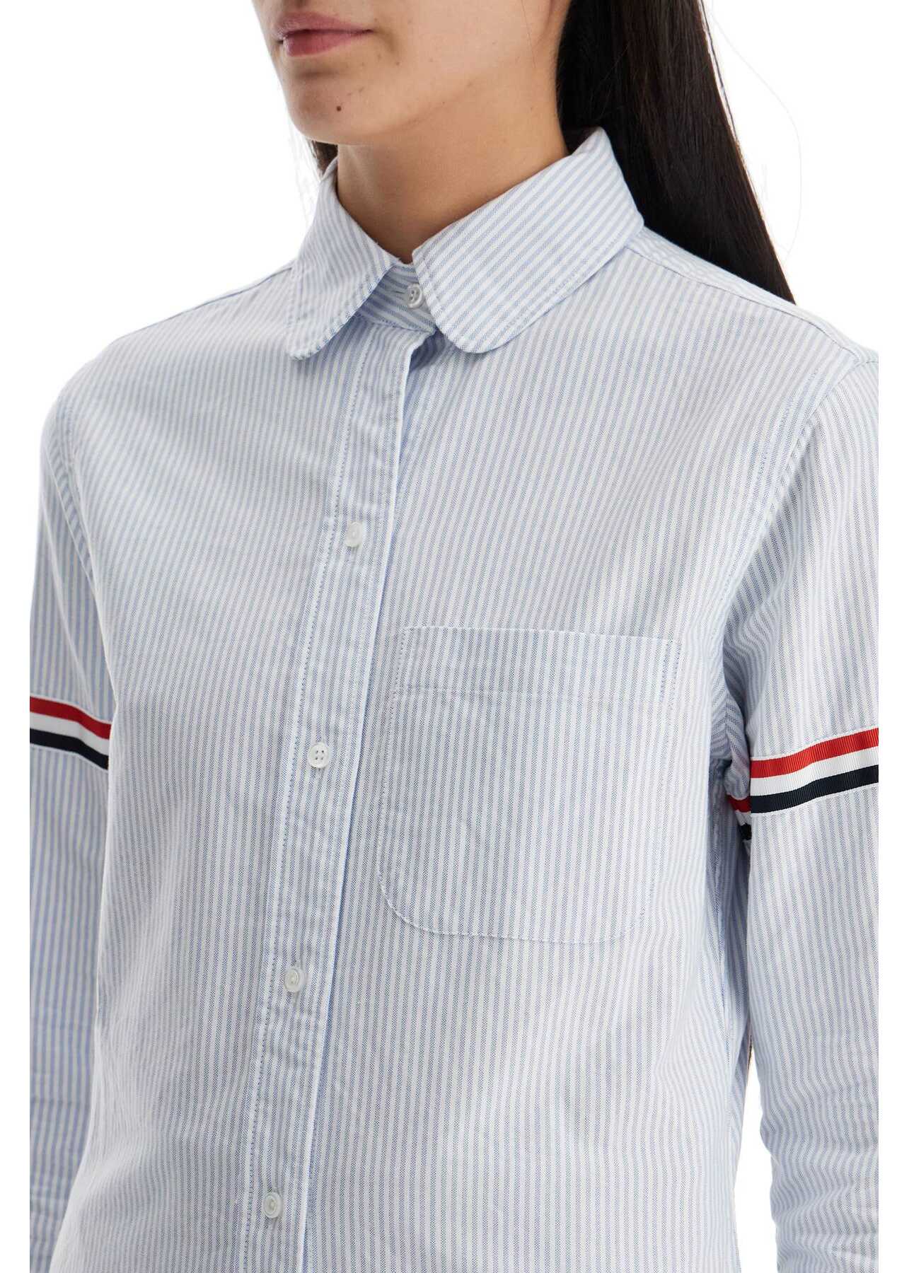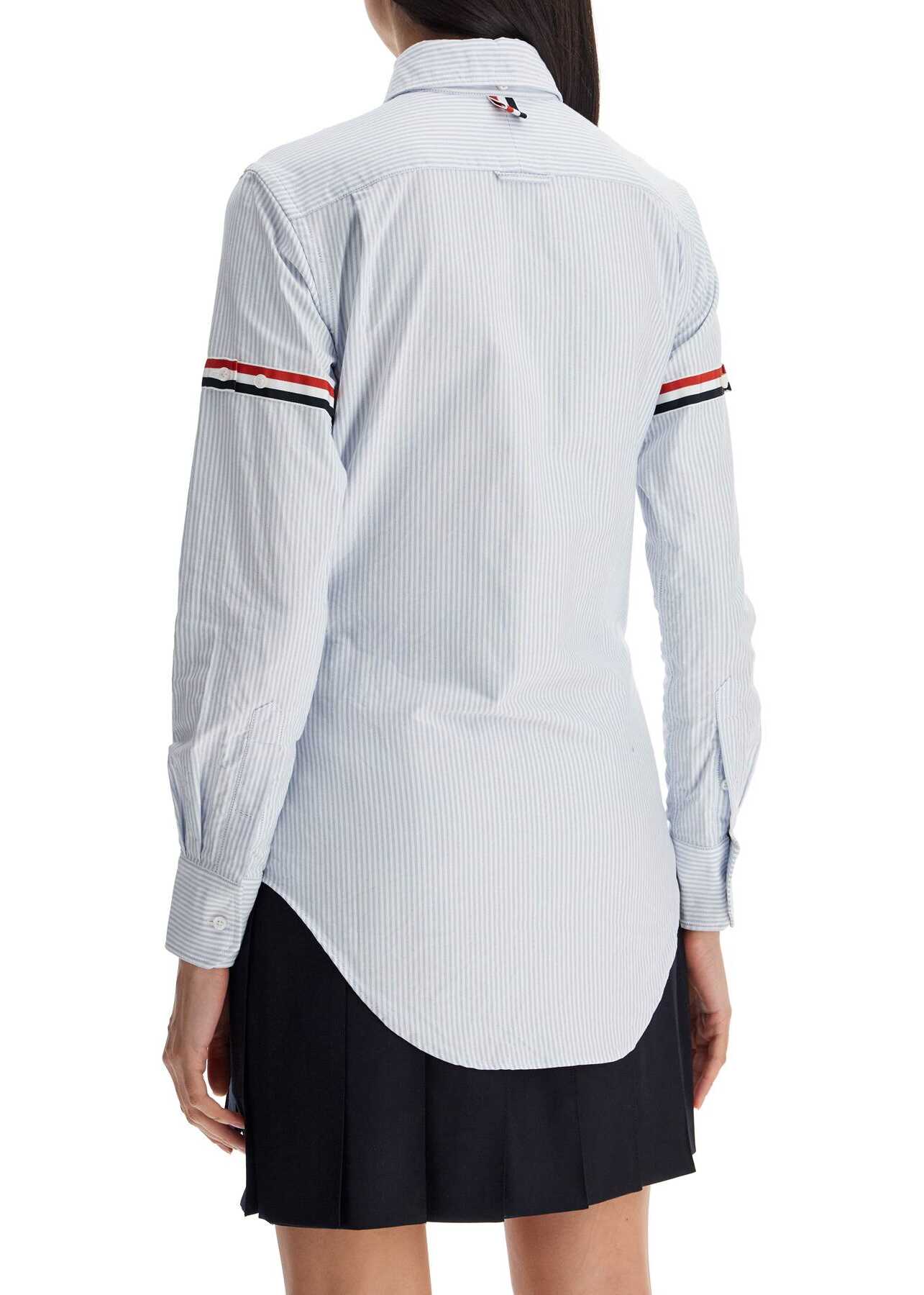 Thom Browne classic shirt in Oxford cotton featuring tricolor grosgrain inserts with adjustable tab on sleeves. Classic round collar with single button on the back, front closure with mother-of-pearl buttons, chest patch pocket, one-button cuffs and rounded hem. It features the iconic tricolour striped ribbon loop tab on the back of neck and the logo tag on front. Regular fit. The model is 177 cm tall and wears a size IT 38.
