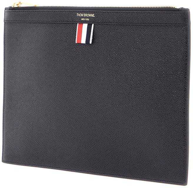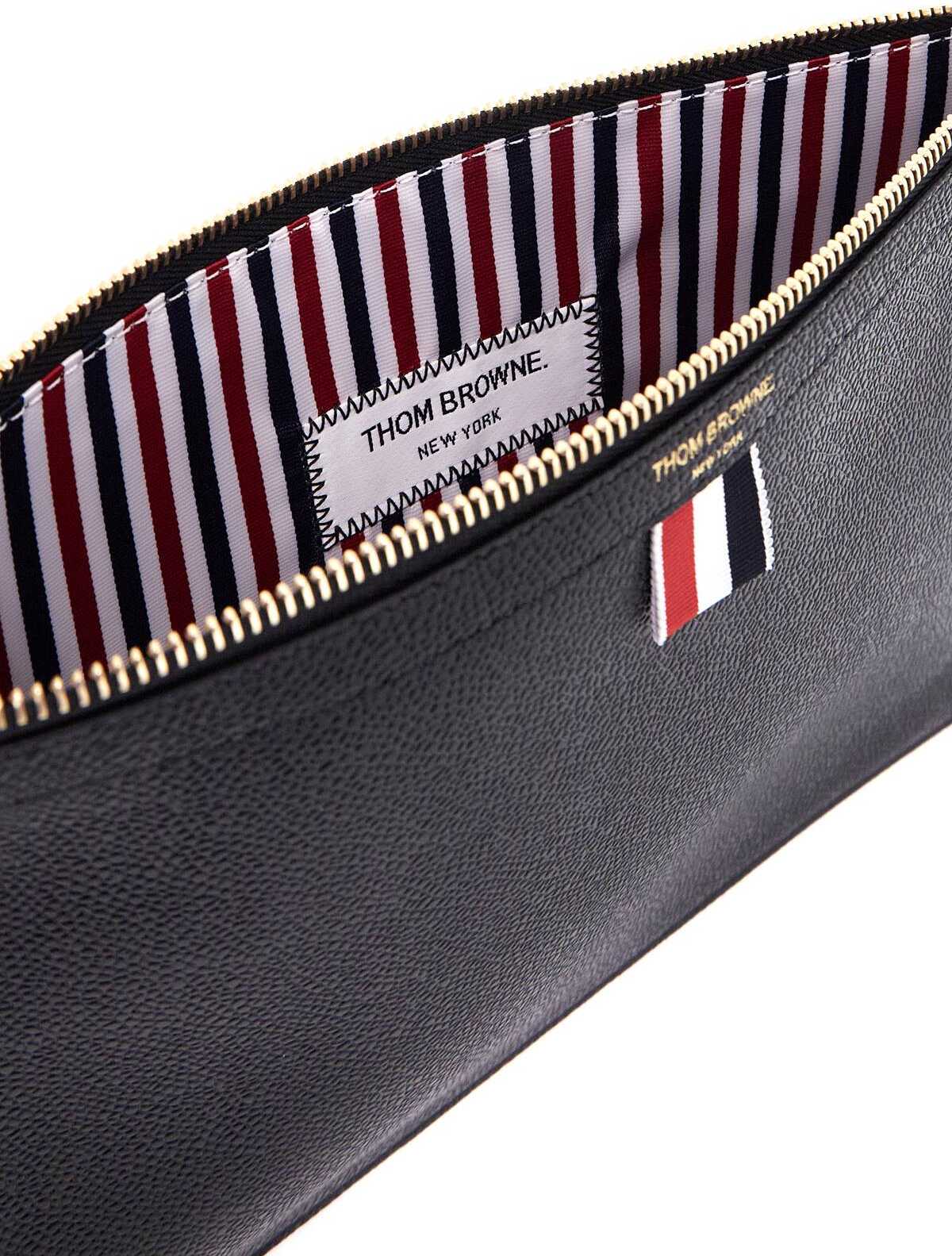 Thom Browne small document holder in pebble grain leather enriched with the iconic tricolor ribbon applied on front. Zip closure, gold-tone logo print, interior lined in striped fabric with the brand's colors, gold-tone metal hardware.