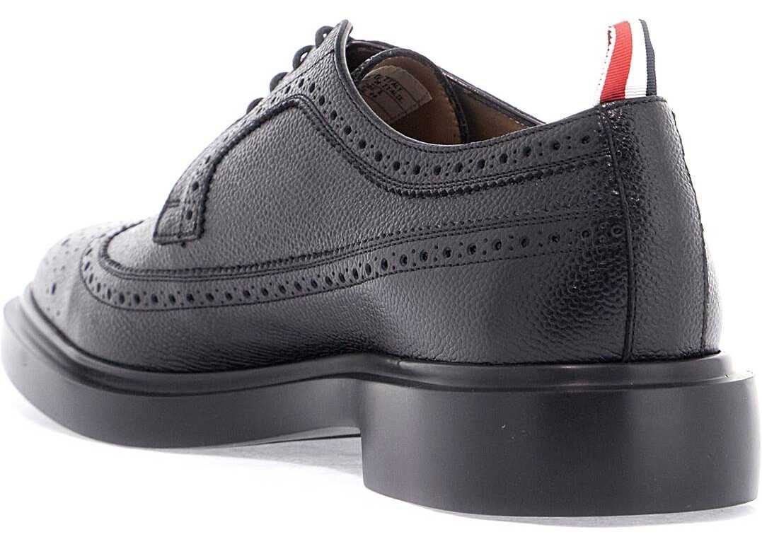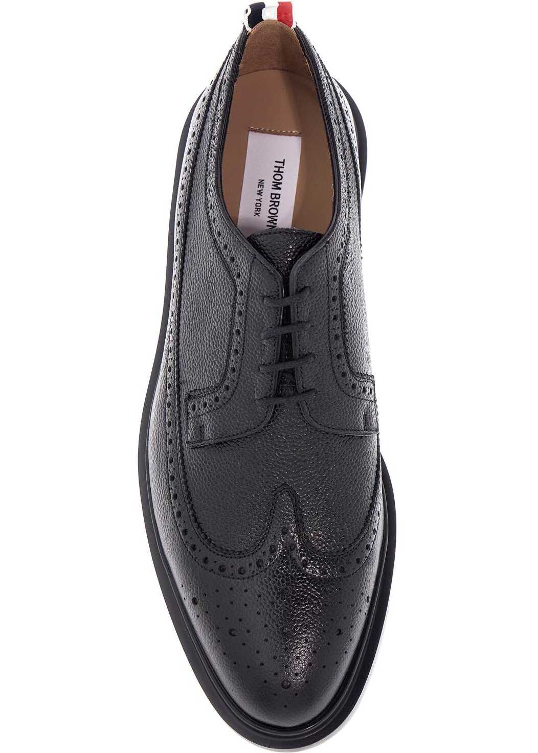 Thom Browne lace-up shoes made of shiny Pebble Grain leather with Longwing Brogue decoration, detailed by the iconic tricolor grosgrain tab on the back. Leather interior and lightweight rubber sole.