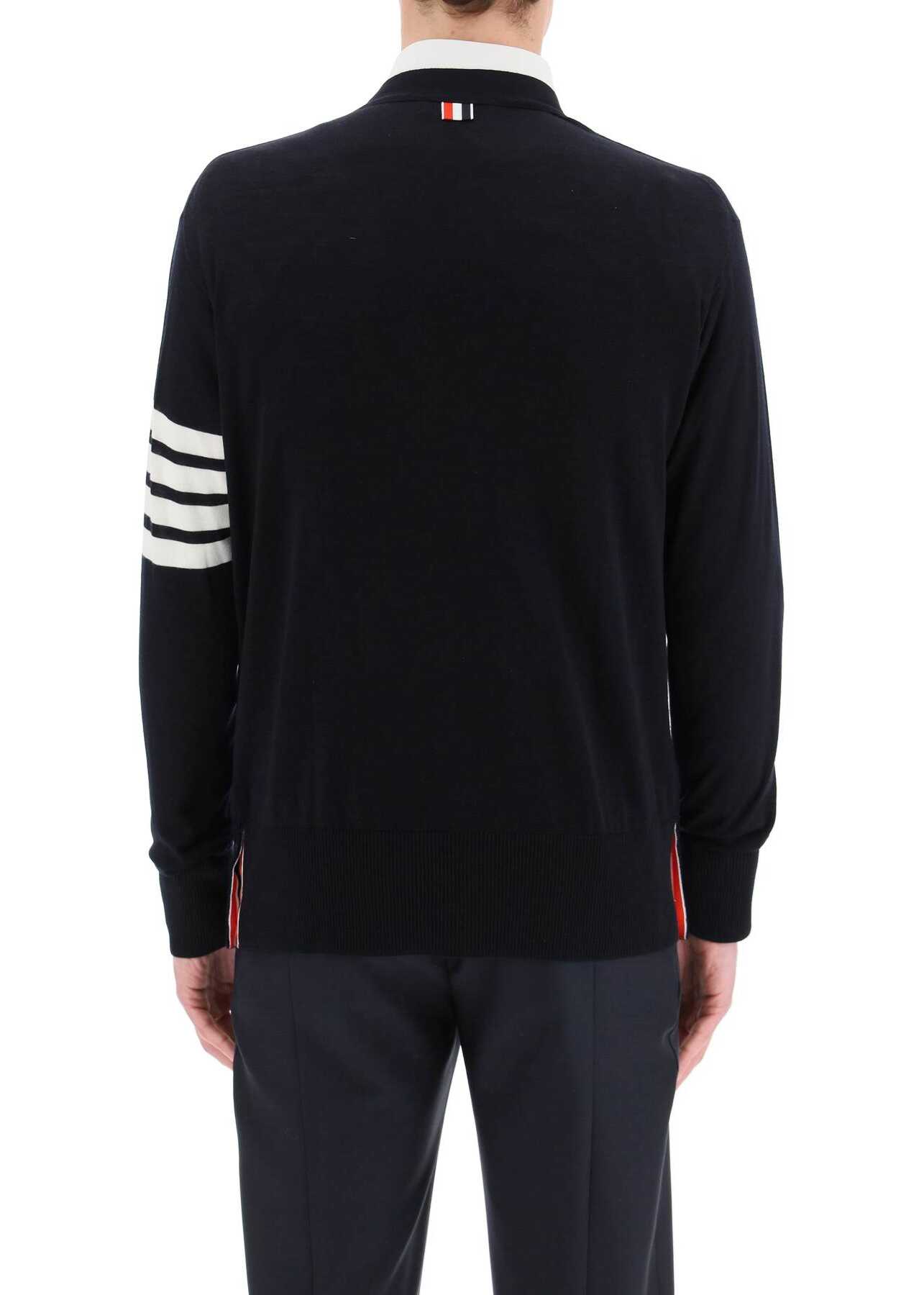 The THOM BROWNE men's cardigan in merino wool offers timeless elegance. Pale grey with four white stripes, it combines comfort and Italian style for a versatile and refined look.