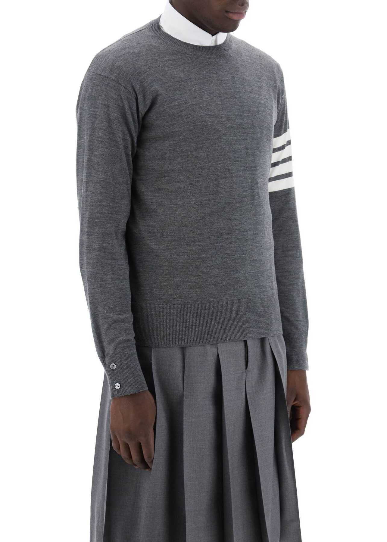 This Thom Browne crewneck pullover is made of lightweight merino wool and features a contrasting 4-Bar detail on the left sleeve. It has ribbed edges, a finished hem with side slits and mother-of-pearl buttons, and tricolor grosgrain finishes on the inside. Regular fit. The model is 187 cm tall and wears size 3 Thom Browne.