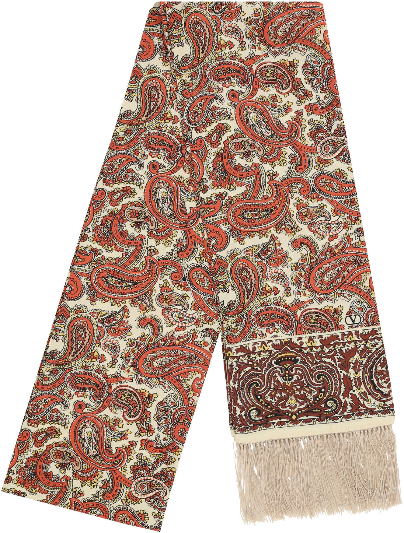 Silk Bandeaux Voyage Imaginaire Scarf by Valentino Garavani, Voyage Imaginaire print, fringed hems. Measurements: 15 x180 cm.