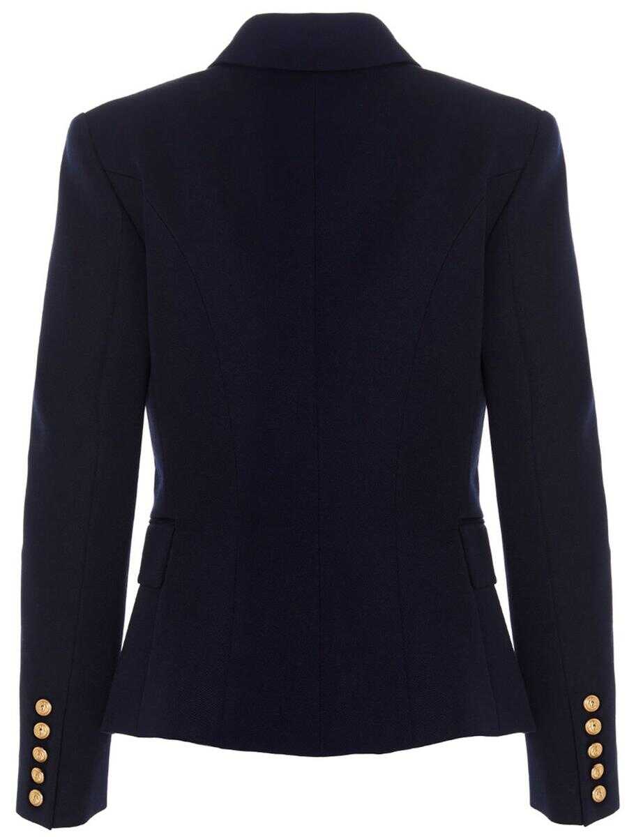 double-breasted wool blazer from Balmain featuring navy blue, wool, embossed gold-tone buttons, peak lapels, double-breasted button fastening, fitted waistline, long sleeves, chest welt pocket and two front flap pockets.