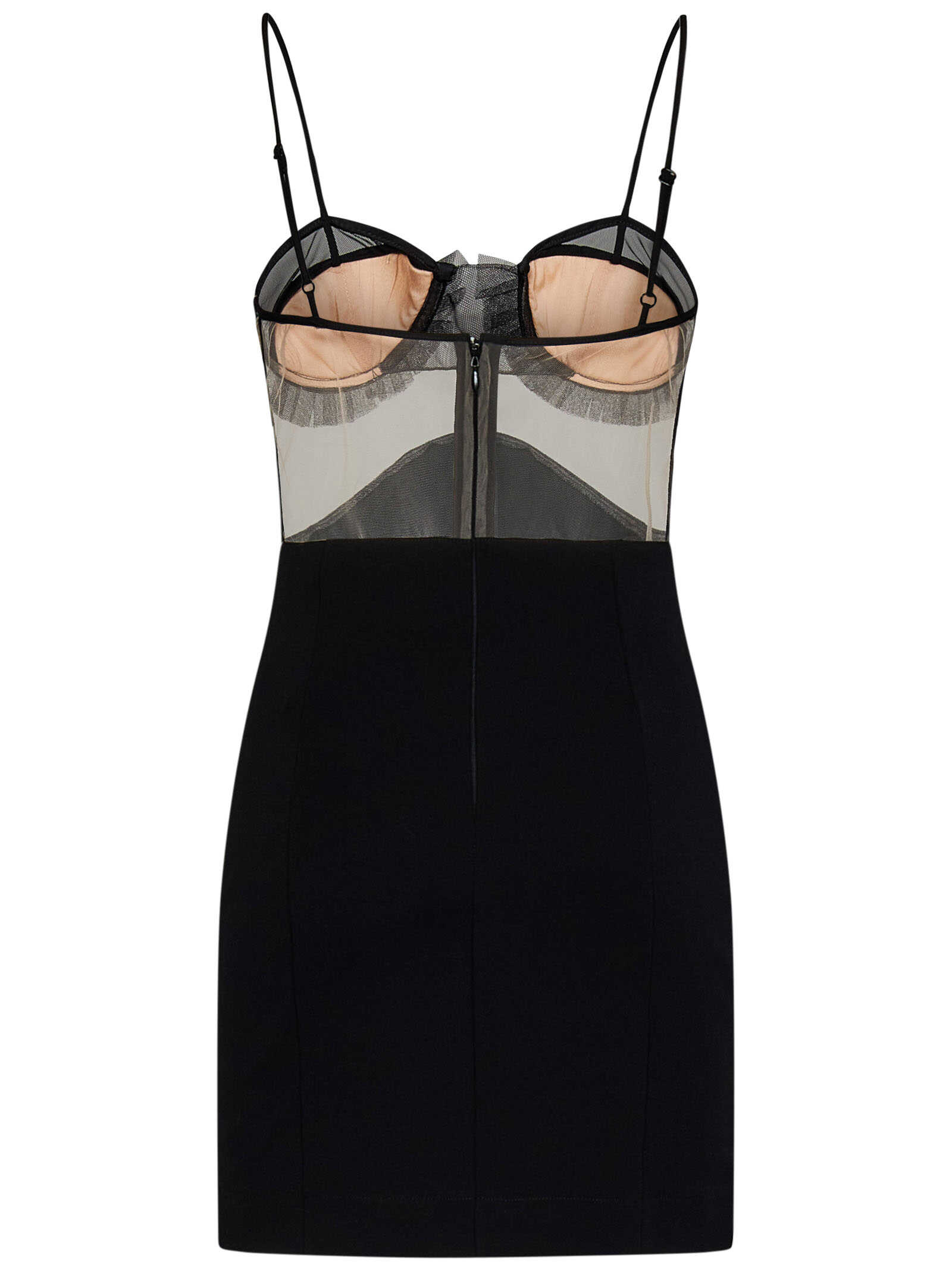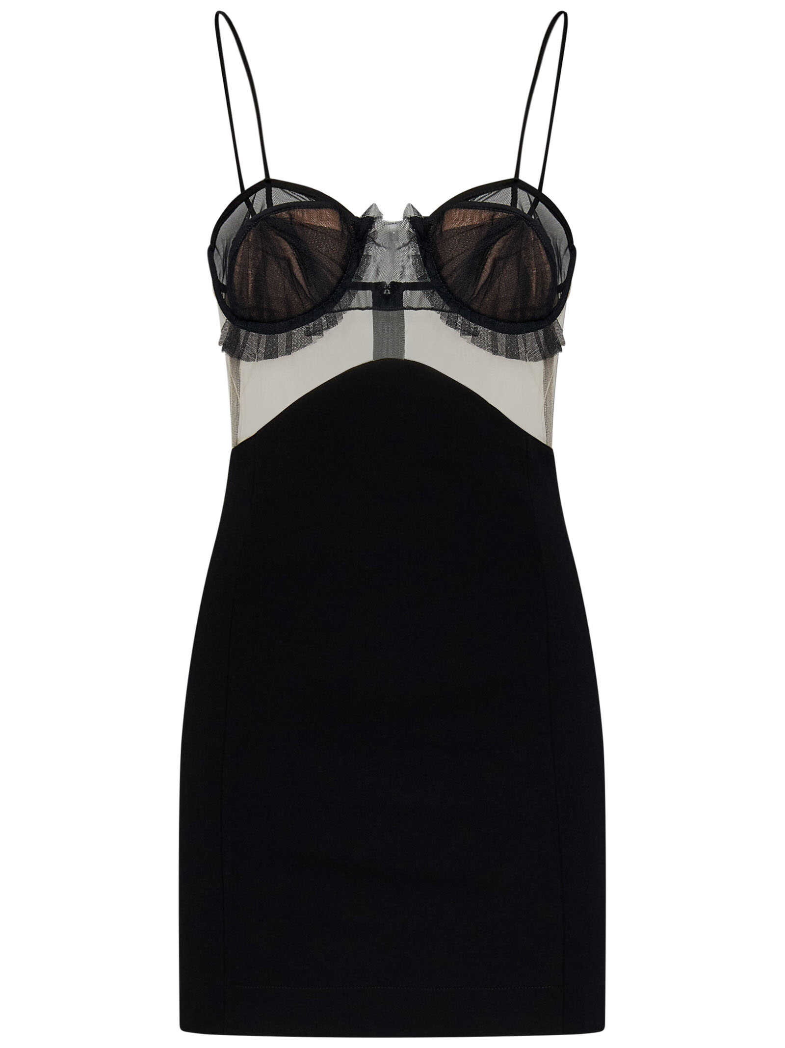 Black stretch viscose jersey minidress with tulle bra with pleated details.