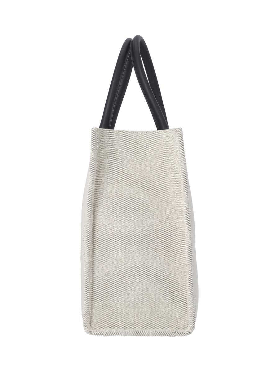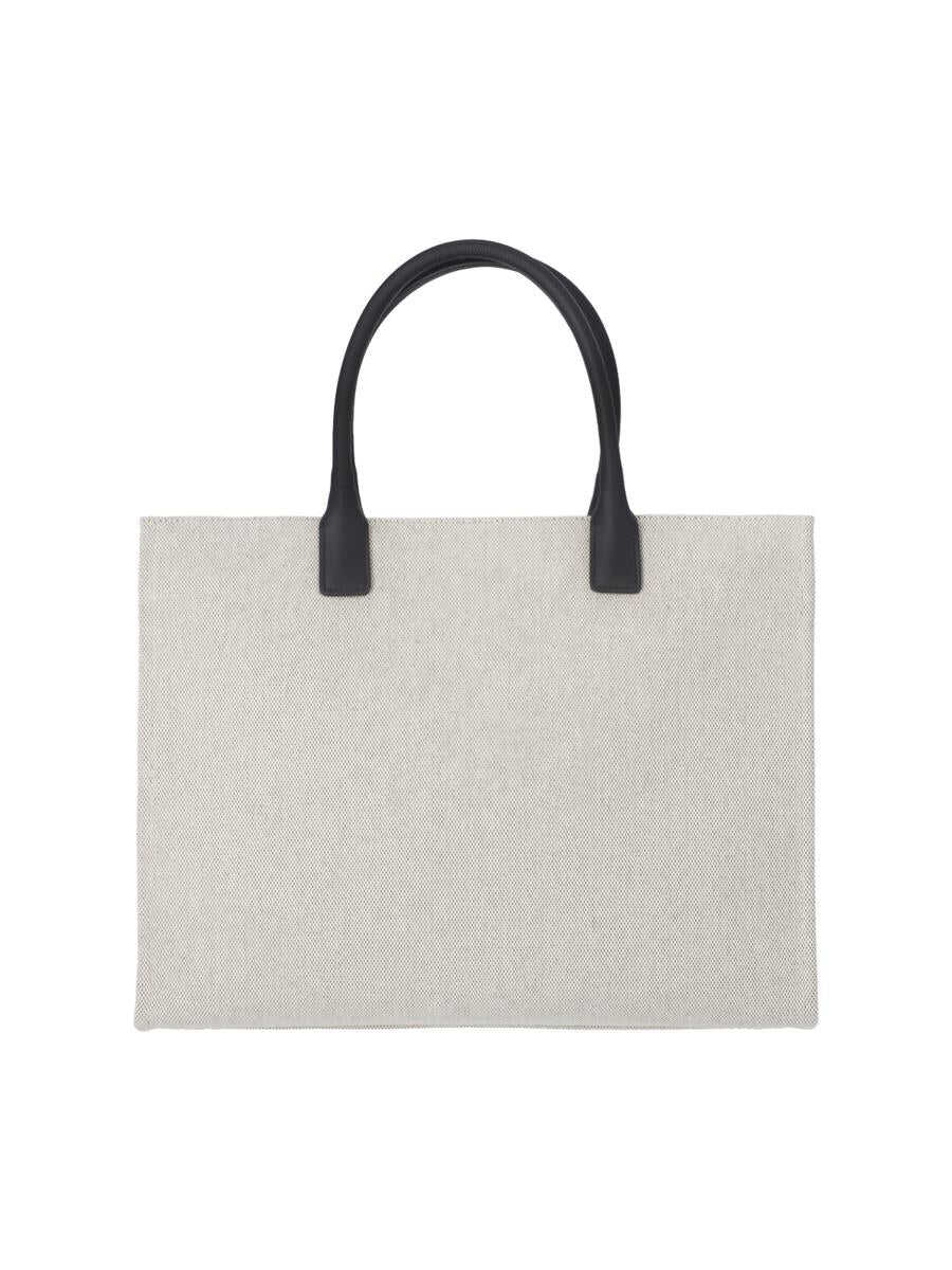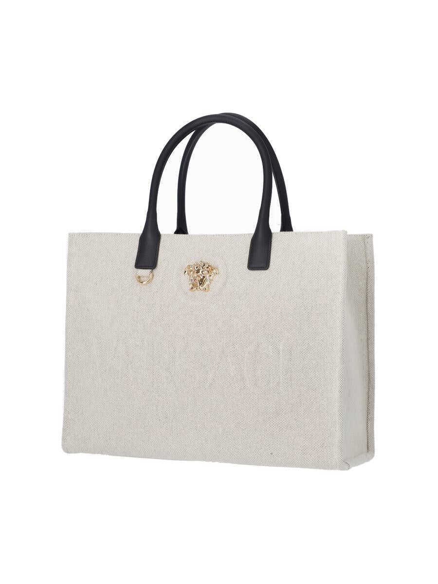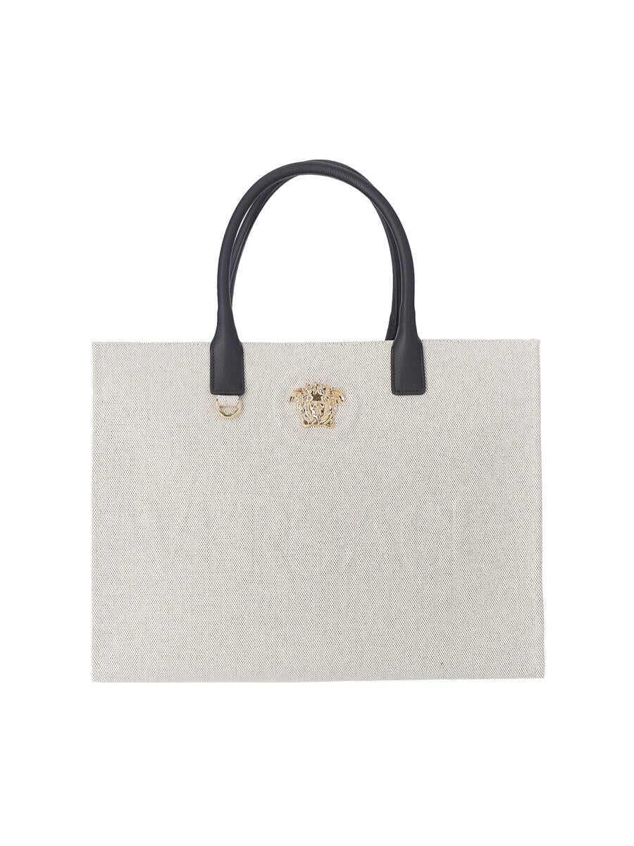 Canvas shopping bag with 'La Medusa' plaque, embossed logo, top leather handles and an inner shoulder strap