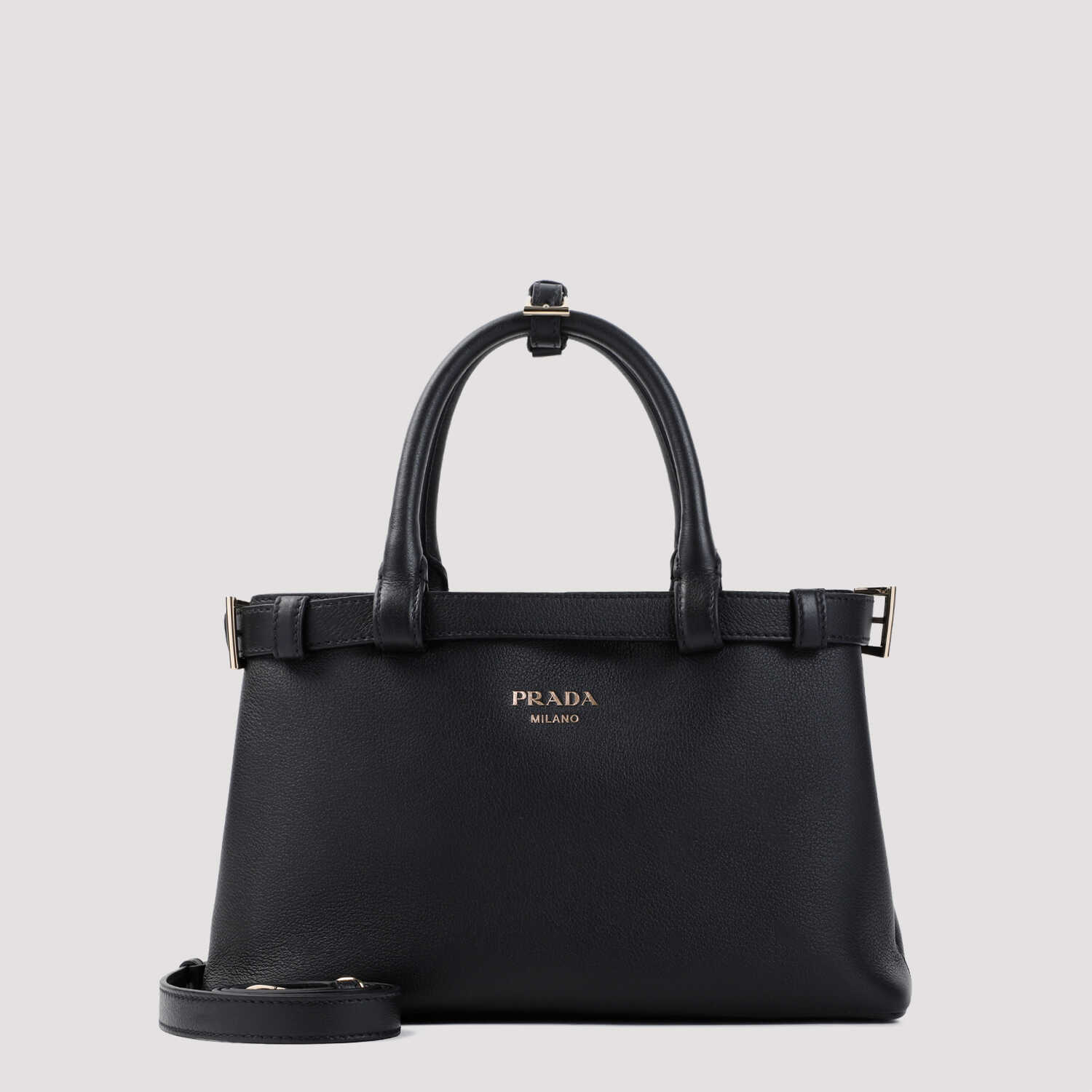Elevate your style with this luxurious Prada handbag. Made from 100% calf leather, it features two top handles, a belt with golden-toned buckles, a stamped logo, and an attachable shoulder strap. The spacious interior includes a patch pocket and soft nappa leather lining. Perfect for any occasion. Grab yours now!