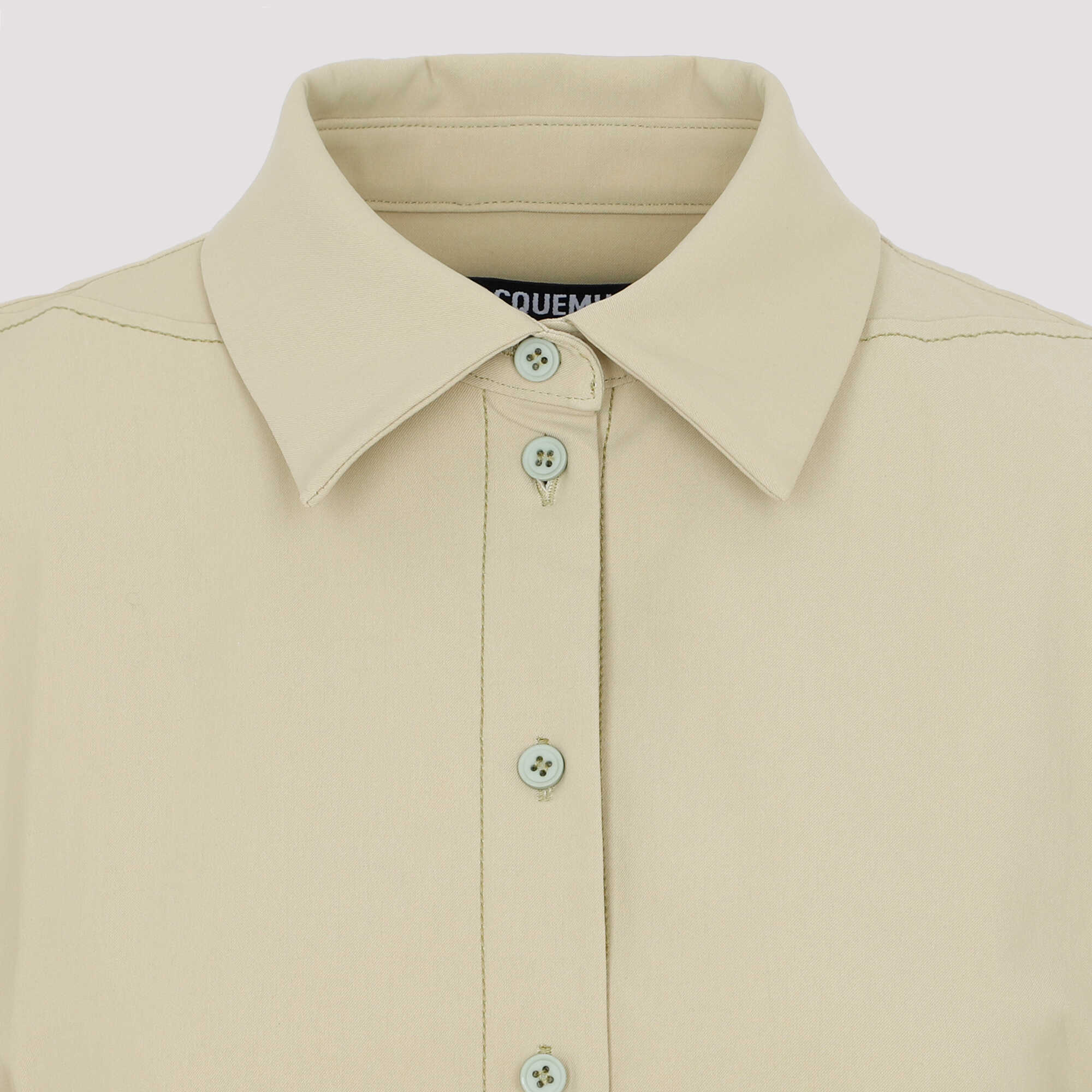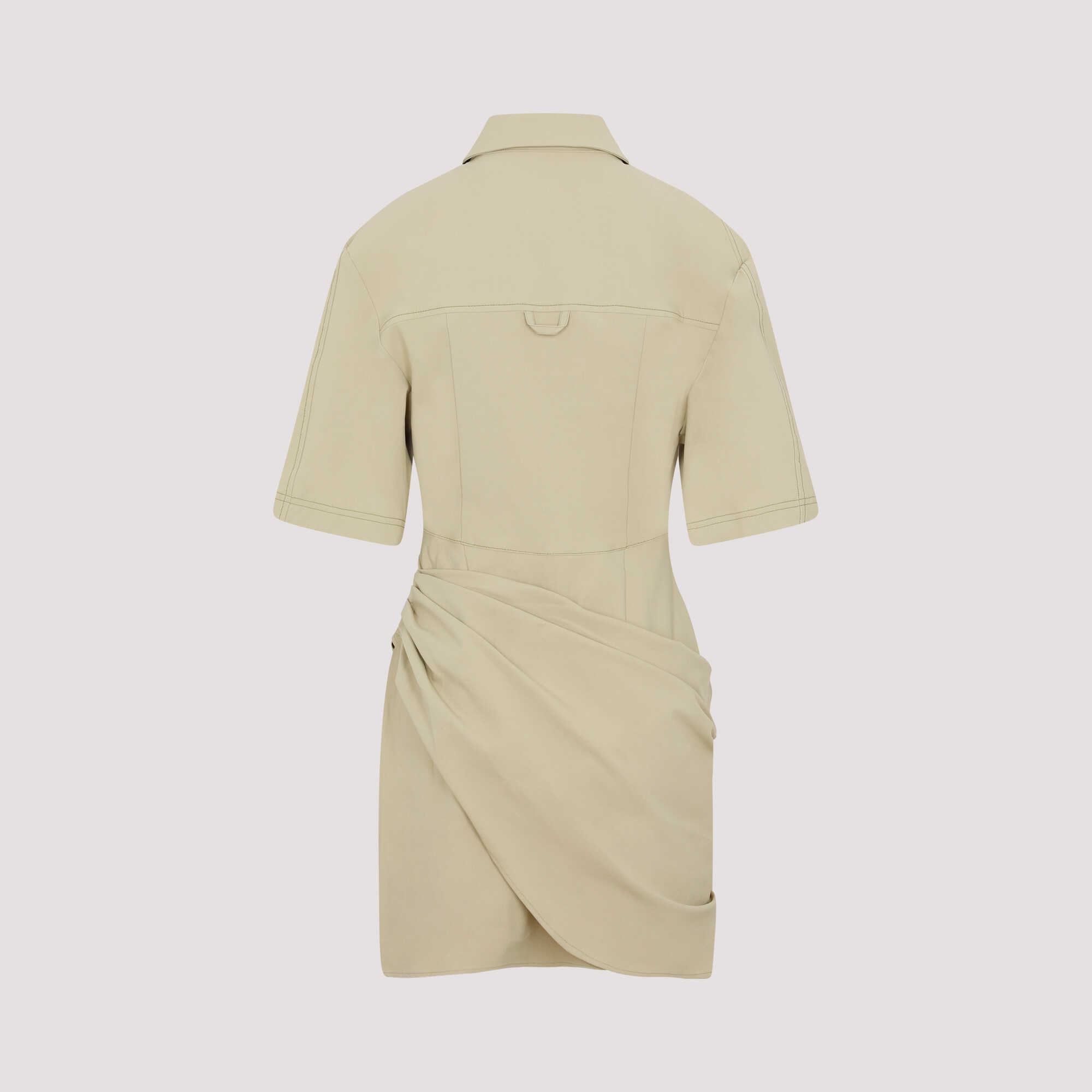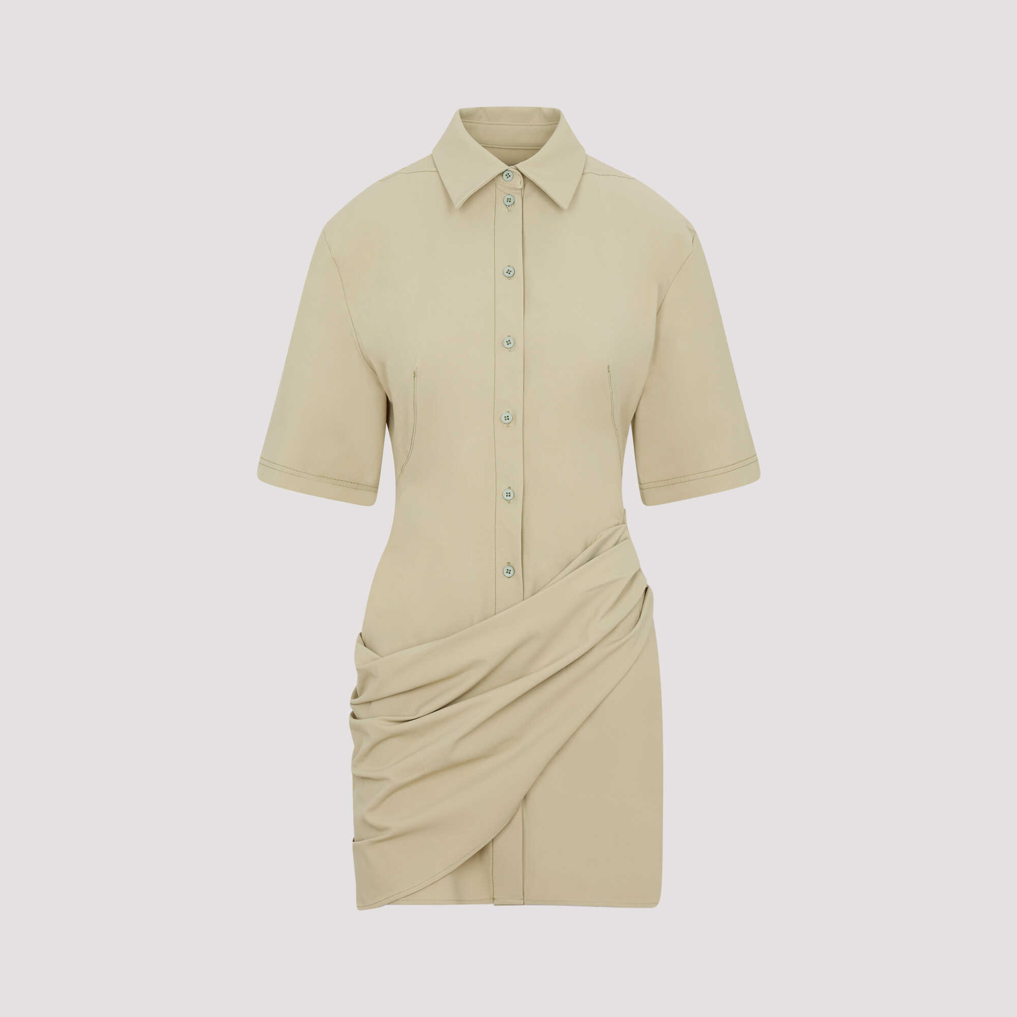 Jacquemus Light Khaki La Robe Camisa Dress. Crafted in a light khaki blend of cotton and tech fabrics. Pointed collar, short elongated sleeves, draped detail on the skirt, round cut-out on the left hip, straight hem.