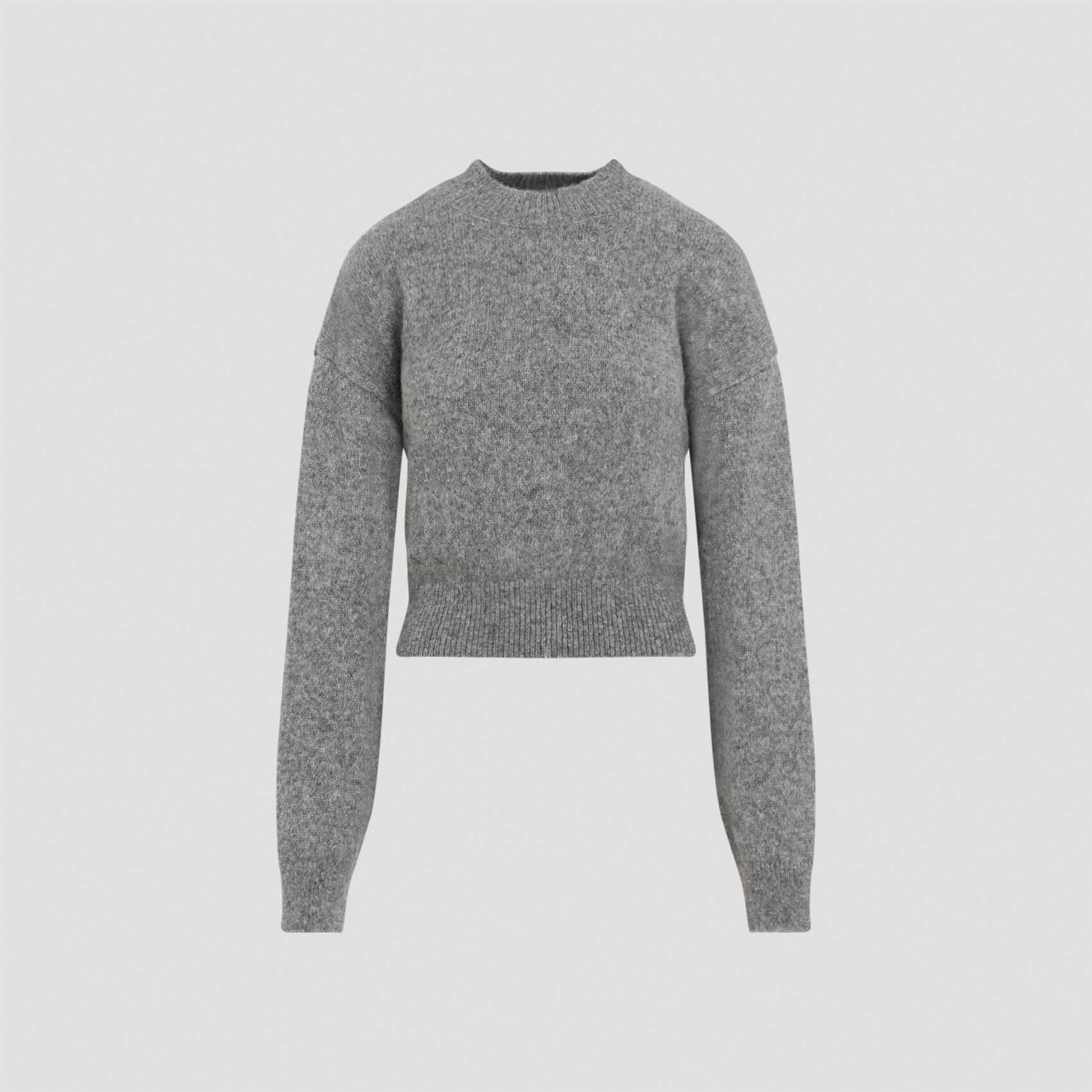 Stay cozy and stylish in this Jacquemus grey alpaca wool pullover. Made with a luxurious blend of alpaca wool, polyamide, and wool, featuring a round ribbed neck, dropped shoulder, and a cropped design. Perfect for a chic and trendy look. Get yours now!