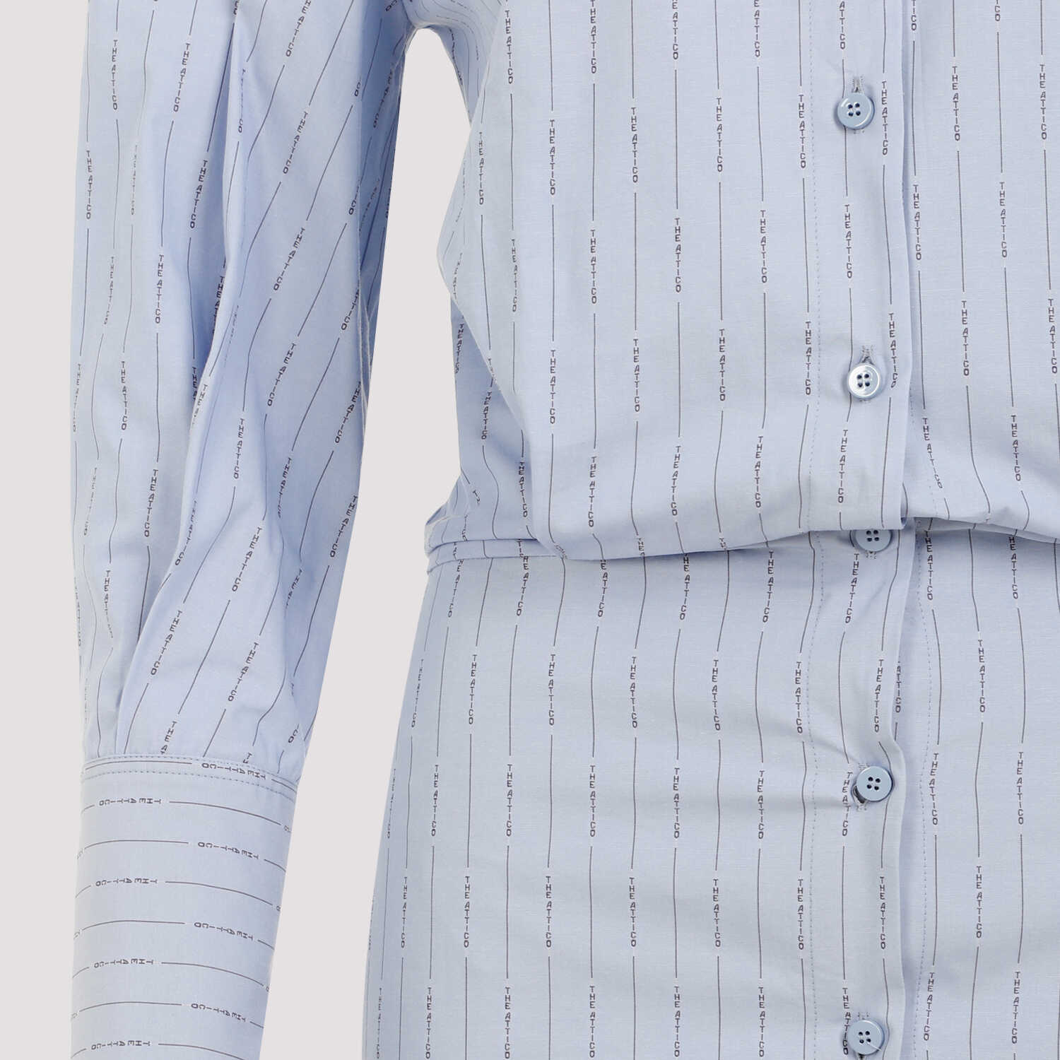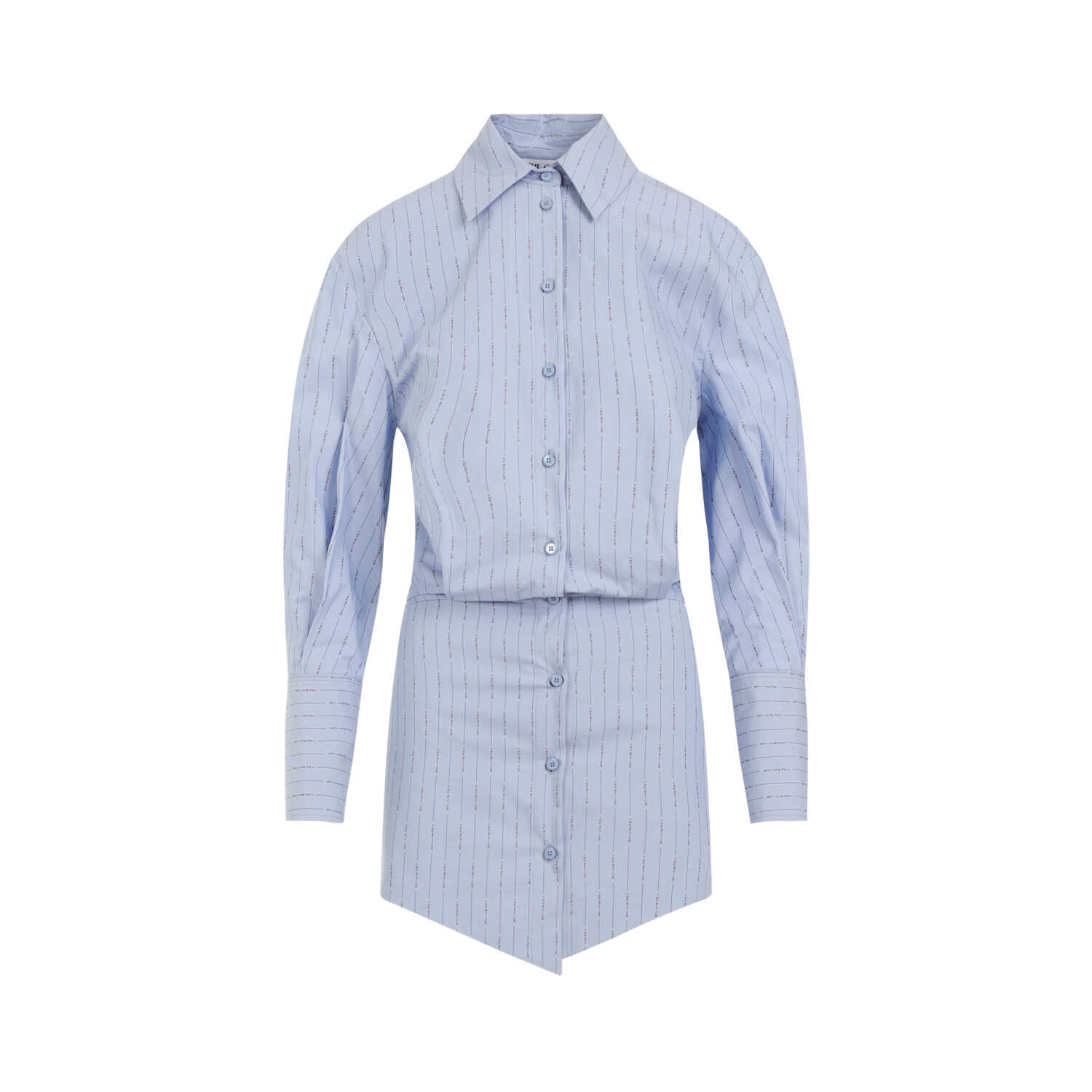 The Attico Silvye Blue Navy Sky Cotton Mini Dress. Crafted in light blue cotton, blue navy signature pattern all over, pointed collar, front button closure, dropped shoulders, balloon long sleeves with buttoned cuffs, top with oversized effect, pointed hem front and back.