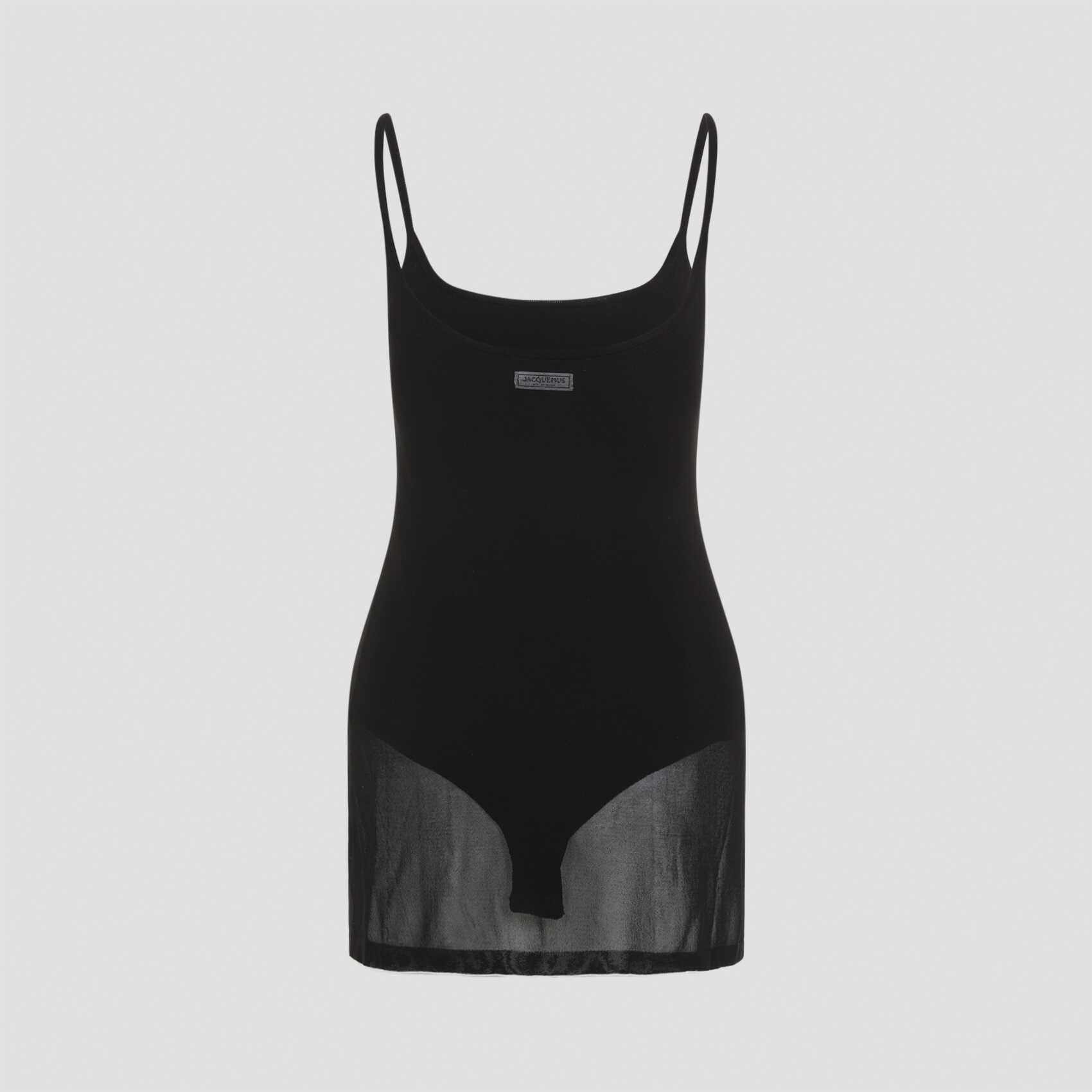 Stand out in style with this black mini dress from JACQUEMUS. Made from a luxurious blend of viscose, polyamide, and elastane, this dress features a u-neck, thin straps, and a sleeveless design. The transparent fabric and integrated bodysuit add a touch of elegance to the mini-length dress with a straight hem. Perfect for any occasion, this dress is a must-have for fashion-forward women.